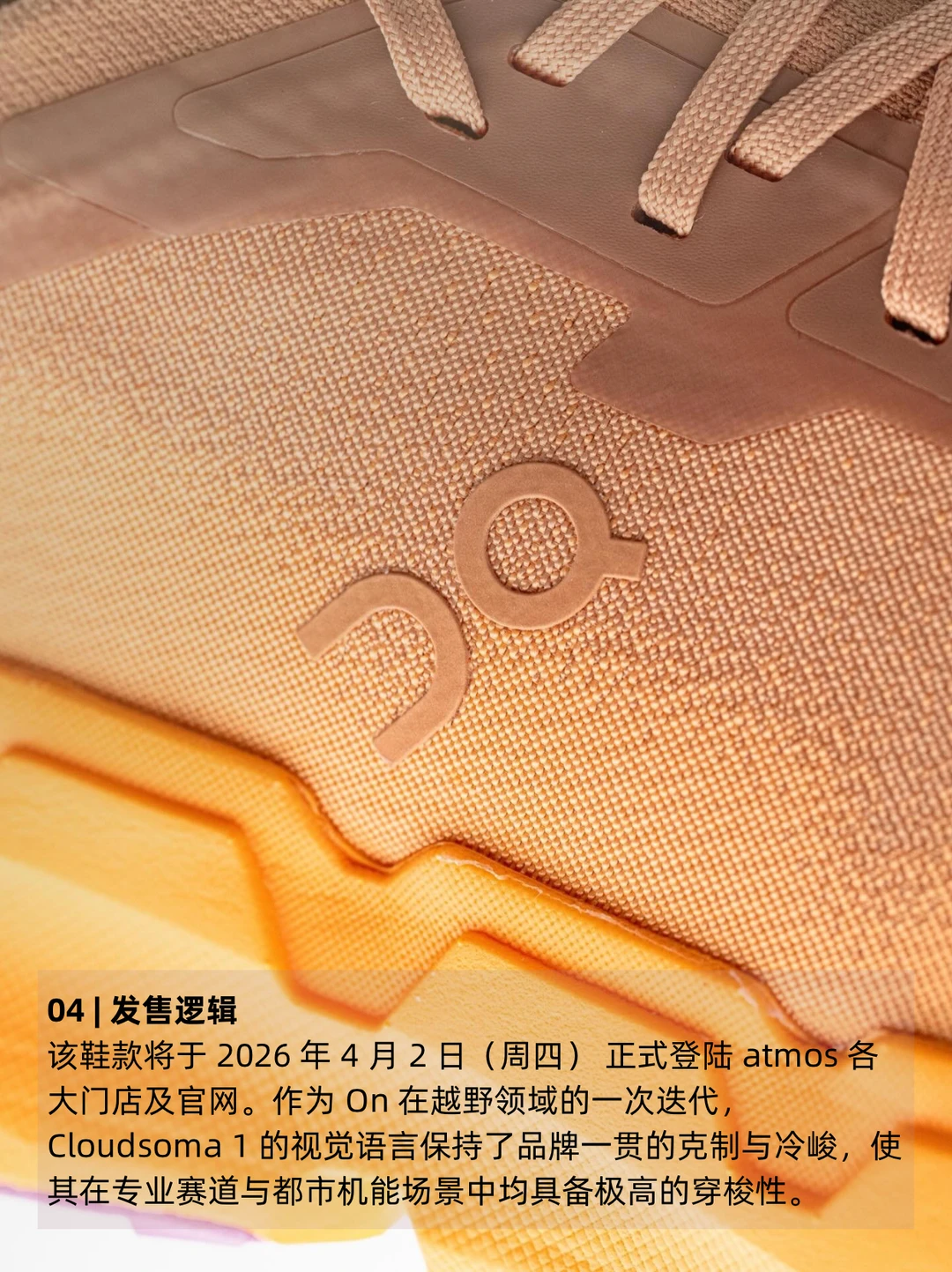 该鞋款将于 2026 年 4 月 2 日(周四) 正式登陆 atmos 各大门店及官网。作为 On 在越野领域的一次迭代,Cloudsoma 1 的视觉语言保持了品牌一贯的克制与冷峻,使其在专业赛道与都市机能场景中均具备极高的穿梭性。