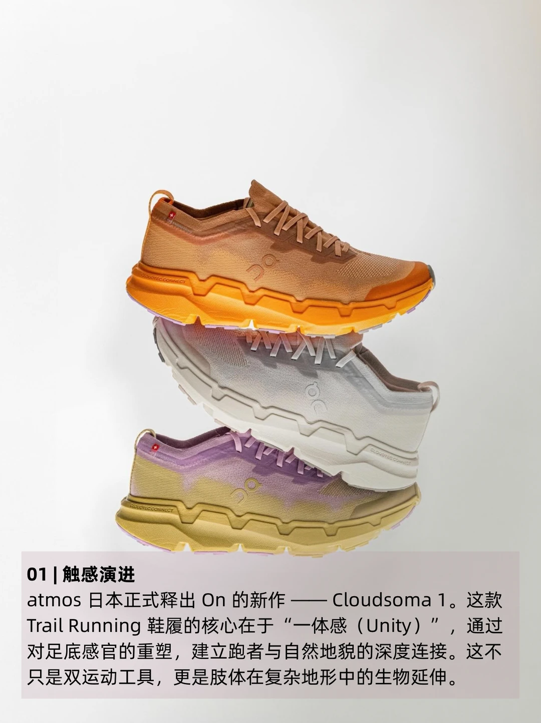 atmos 日本正式释出 On 的新作 —— Cloudsoma 1。这款 Trail Running 鞋履的核心在于“一体感(Unity)”,通过对足底感官的重塑,建立跑者与自然地貌的深度连接。这不只是双运动工具,更是肢体在复杂地形中的生物延伸。