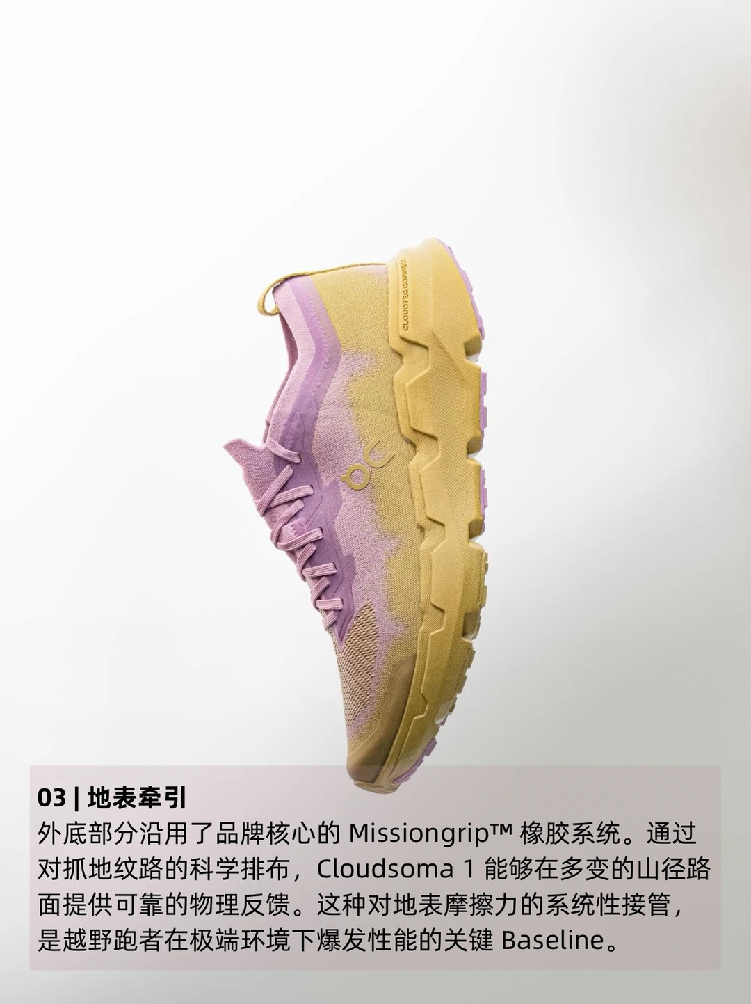 外底部分沿用了品牌核心的 Missiongrip™ 橡胶系统。通过对抓地纹路的科学排布,Cloudsoma 1 能够在多变的山径路面提供可靠的物理反馈。这种对地表摩擦力的系统性接管,是越野跑者在极端环境下爆发性能的关键 Baseline。