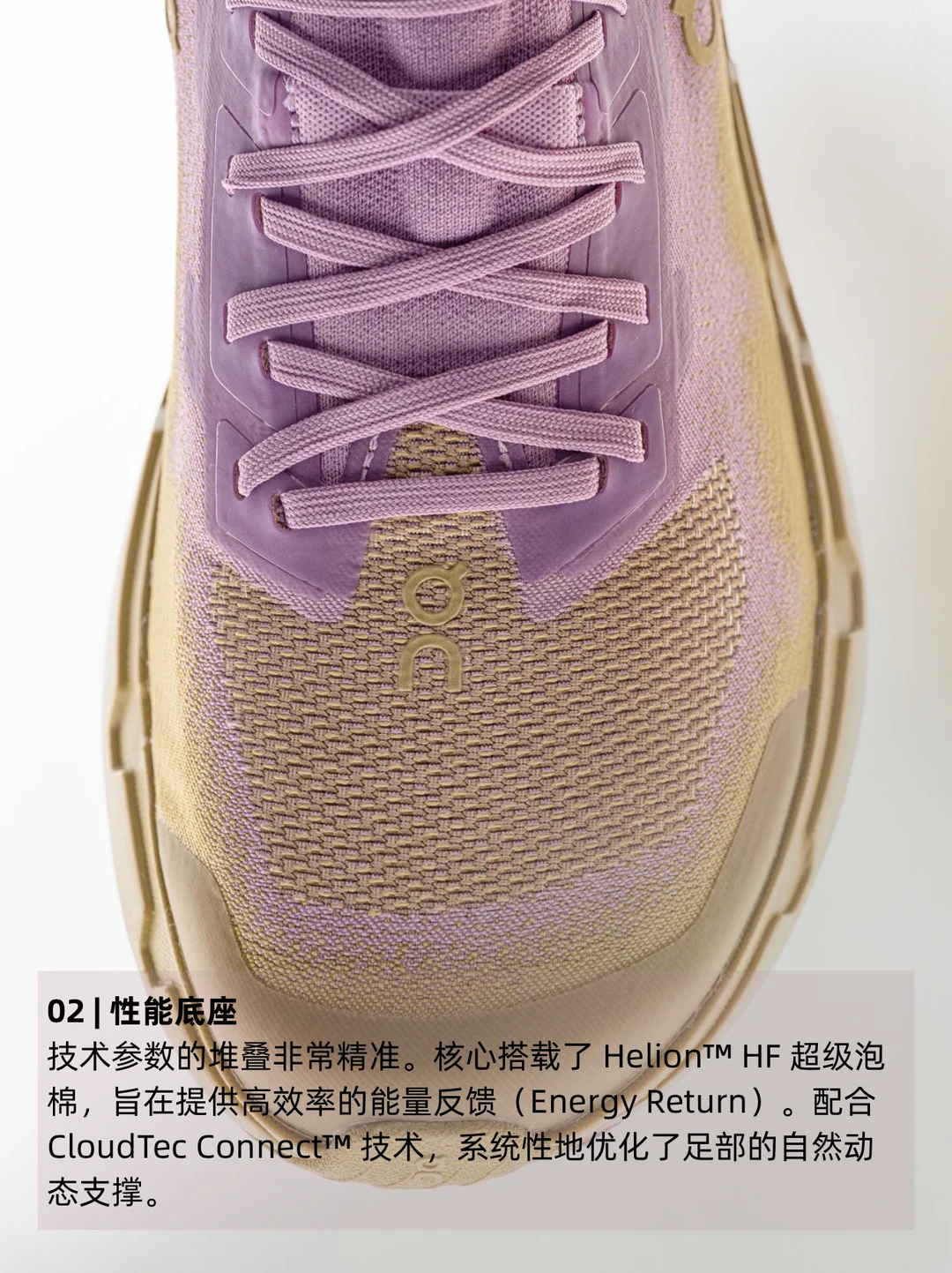 技术参数的堆叠非常精准。核心搭载了 Helion™ HF 超级泡棉,旨在提供高效率的能量反馈(Energy Return)。配合 CloudTec Connect™ 技术,系统性地优化了足部的自然动态支撑。这种对步态的底层重构,确保了在高速越野移动中的能量连续性。