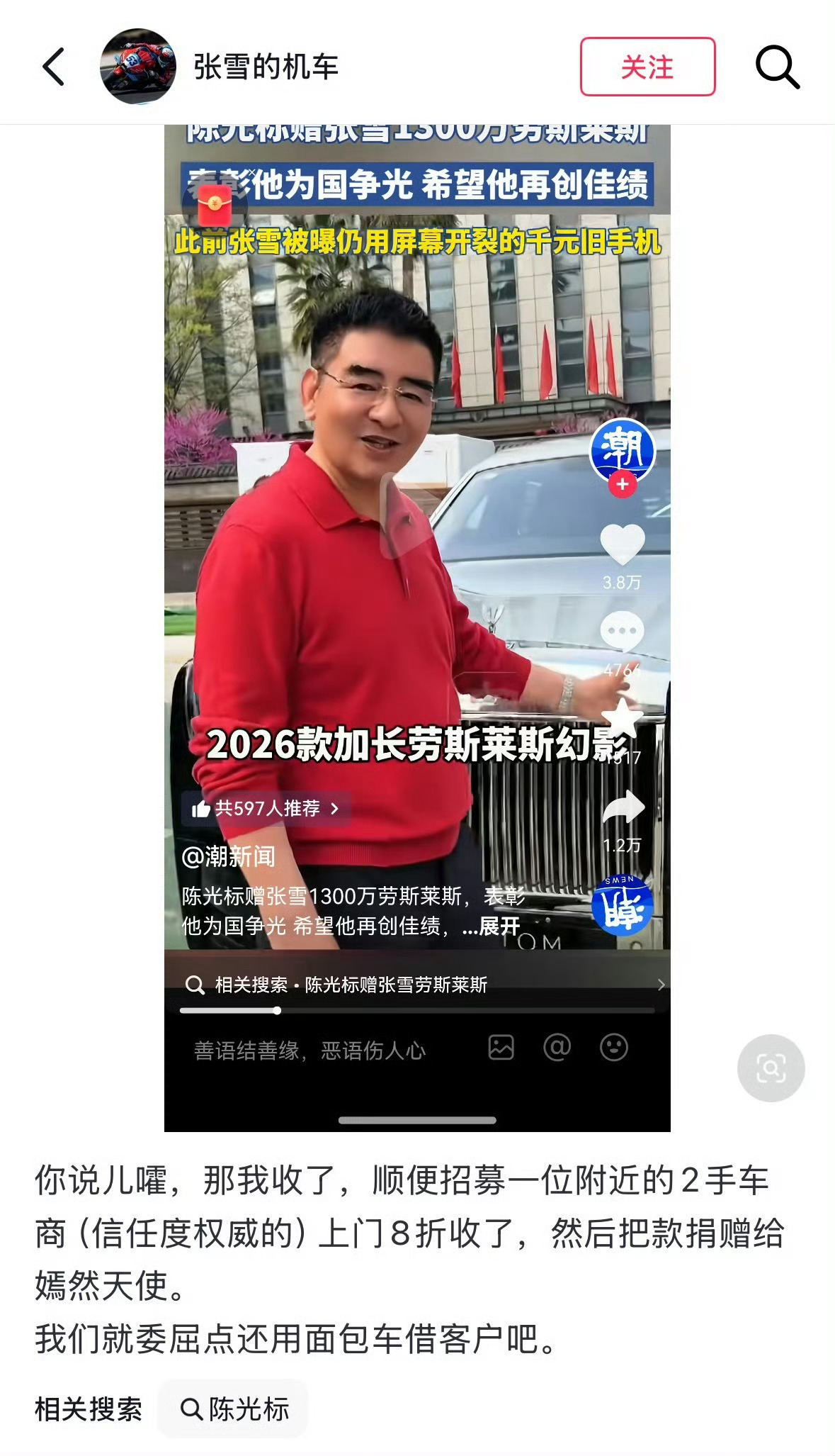 壕气冲天!4月1日,陈光标发布视频,宣布赠送张雪一辆全国唯一的2026款加长版劳
