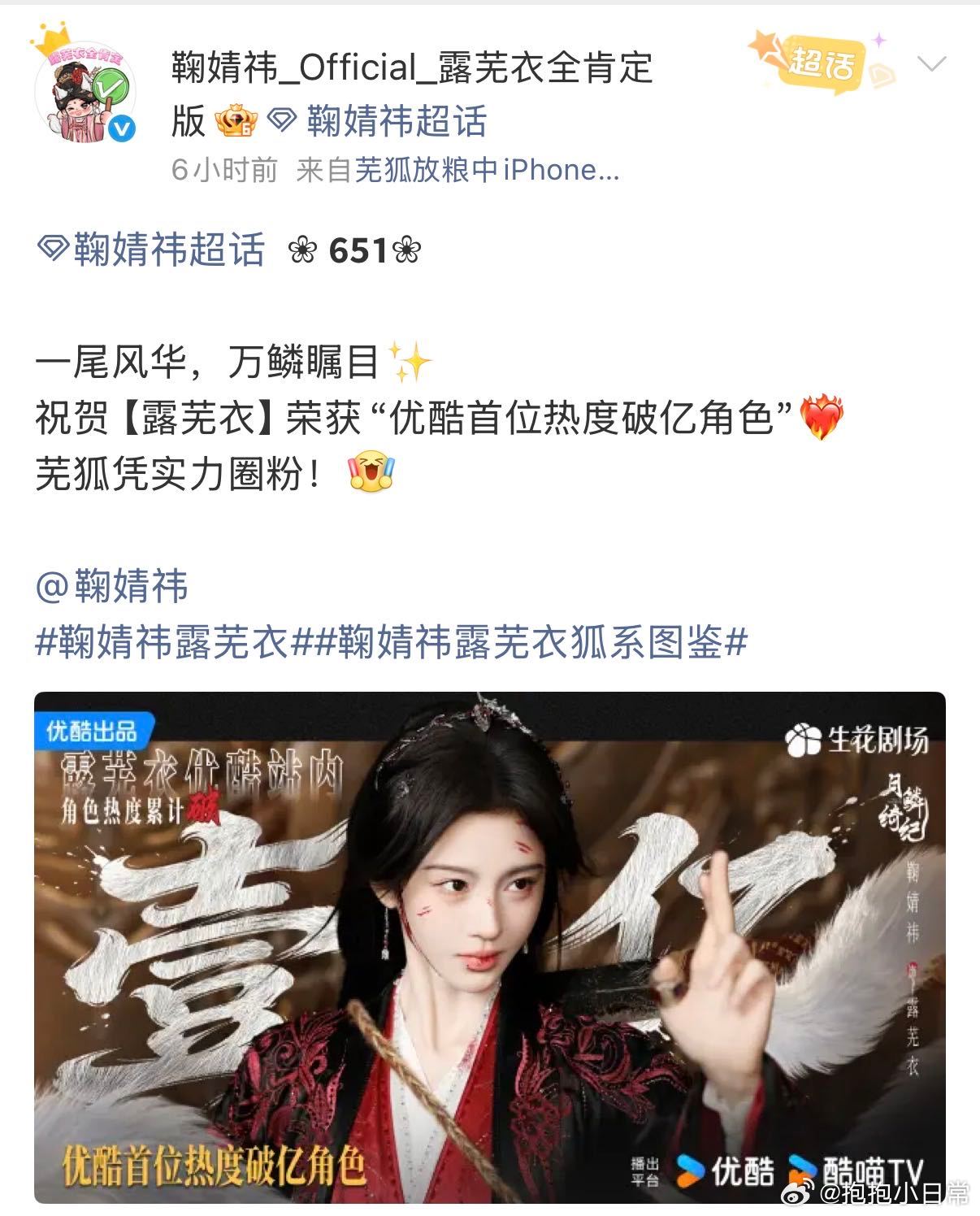 鞠婧祎露芜衣站内角色热度破亿 角色设定和鞠婧祎的演绎完美融合,露芜衣的灵动和小心