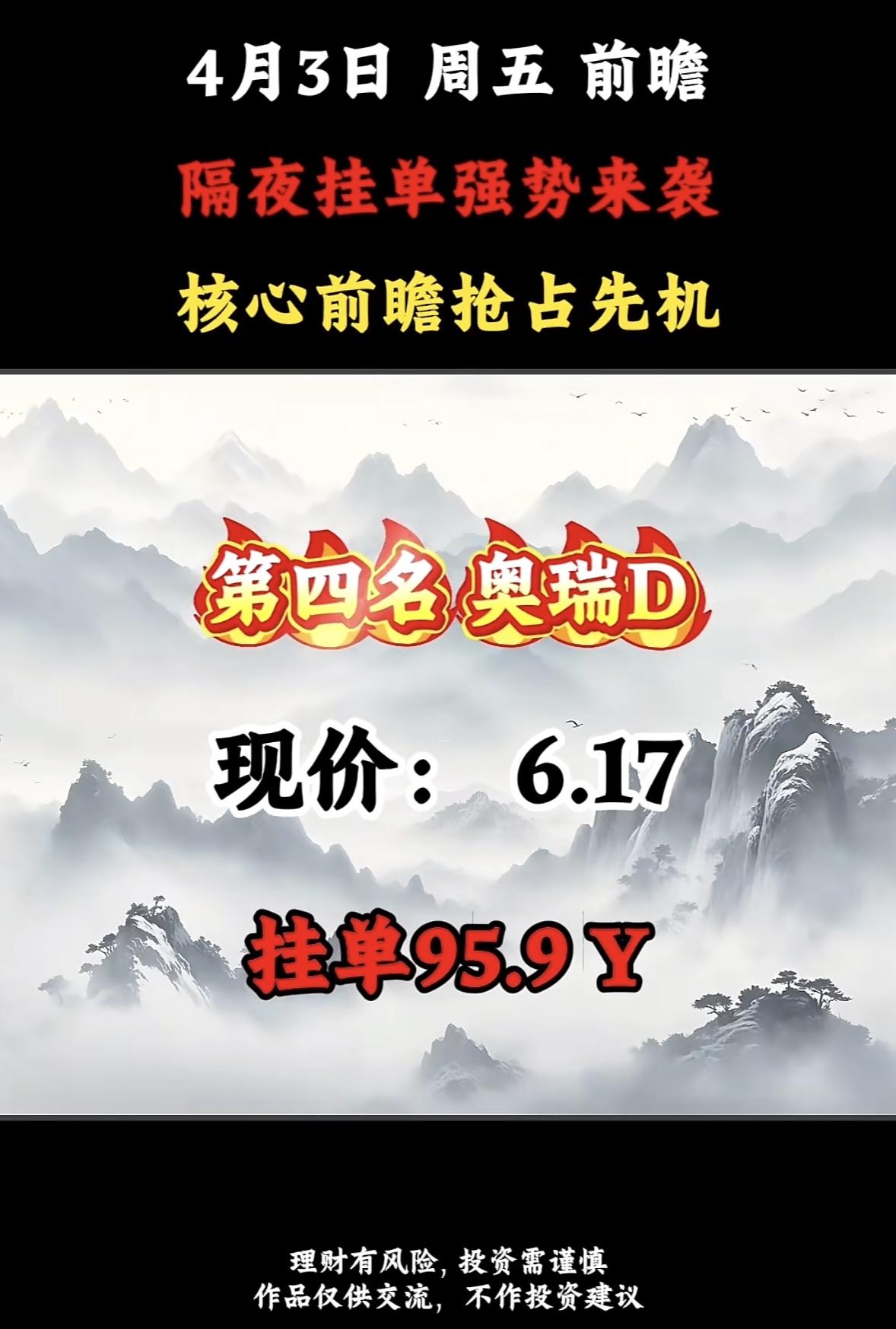 4月3日周五暗盘隔夜挂单排行榜出炉 4月这投资市场可太刺激了,4月3日隔夜挂单强势来袭,核心前瞻能抢占先机。4月1日暗盘挂单就很有看头,8只个股凭借大额挂单金额脱颖而出,挂单金额从54亿攀升至超百亿,资金扎堆布局明显。 还有那700亿隔夜挂单突袭,直接把市场做多情绪拉满。不过老股民都知道,这可能是主力套路。平时A股隔夜挂单也就百亿级别,这次飙到700亿,挂单还全扎堆热门赛道。商业航天、光伏、有色金属成了三大核心主线。咱散户可别盲目追高,得理清资金聚焦赛道,识别市场人气核心,为操作提供参考,可别一不小心就踩坑了。