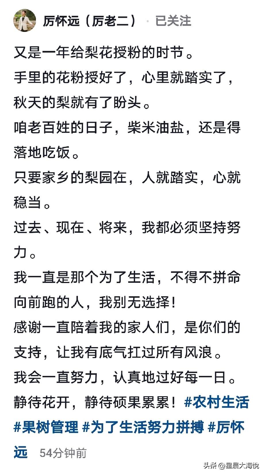 昨天厉怀远更新一个是关于砀山梨园的花开的视频,昨天为梨园除草, 今天为花开授粉, 说真的我还是头一次看到过这样给梨树授粉的, 厉怀远说,又是一年花开季节,手里的花粉授好了,心里就踏实,秋天有了盼头, 为了生活柴米油盐不得不努力,不得不拼命向前,别无选择, 希望厉怀远雨过天空,处理好家事…