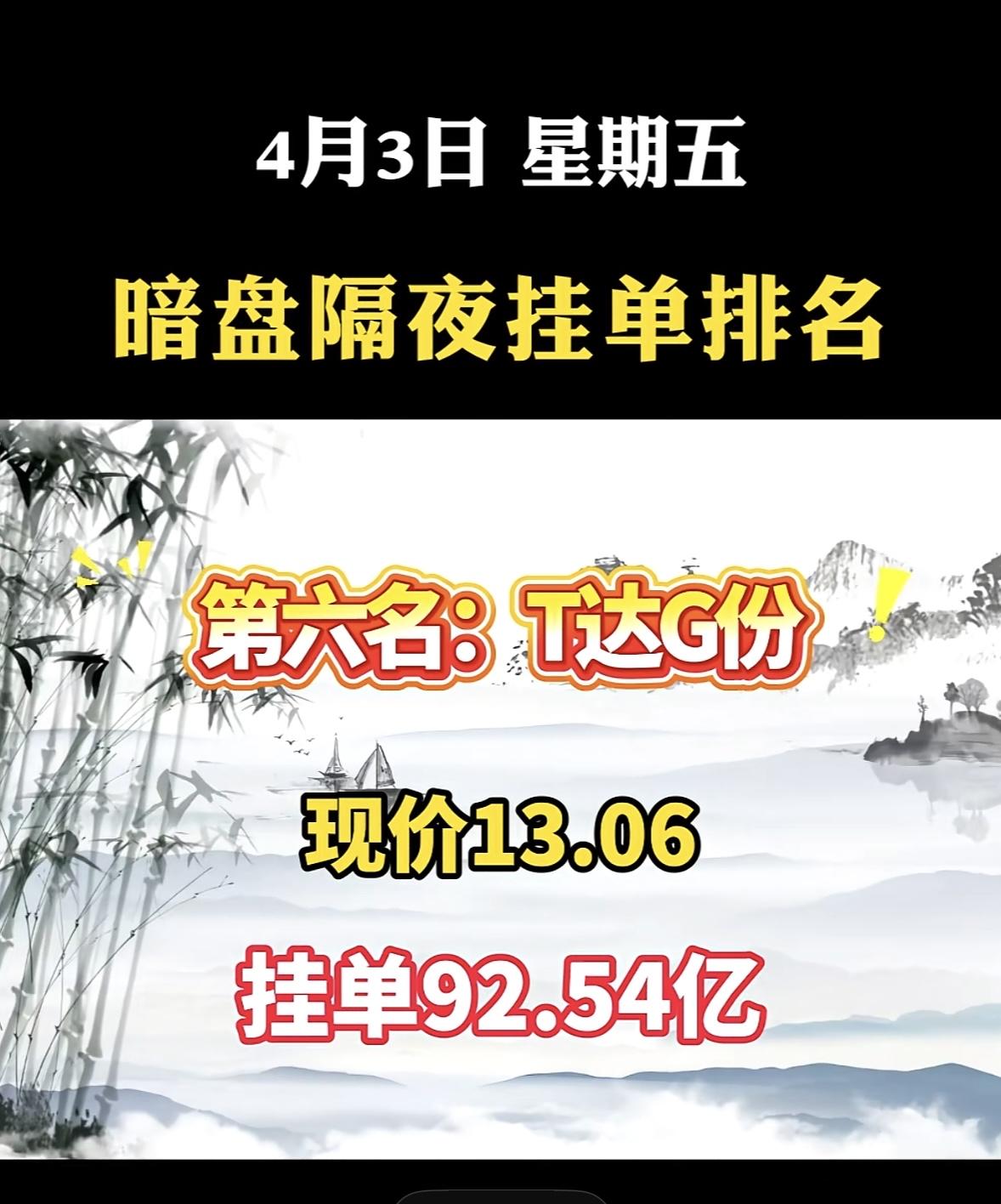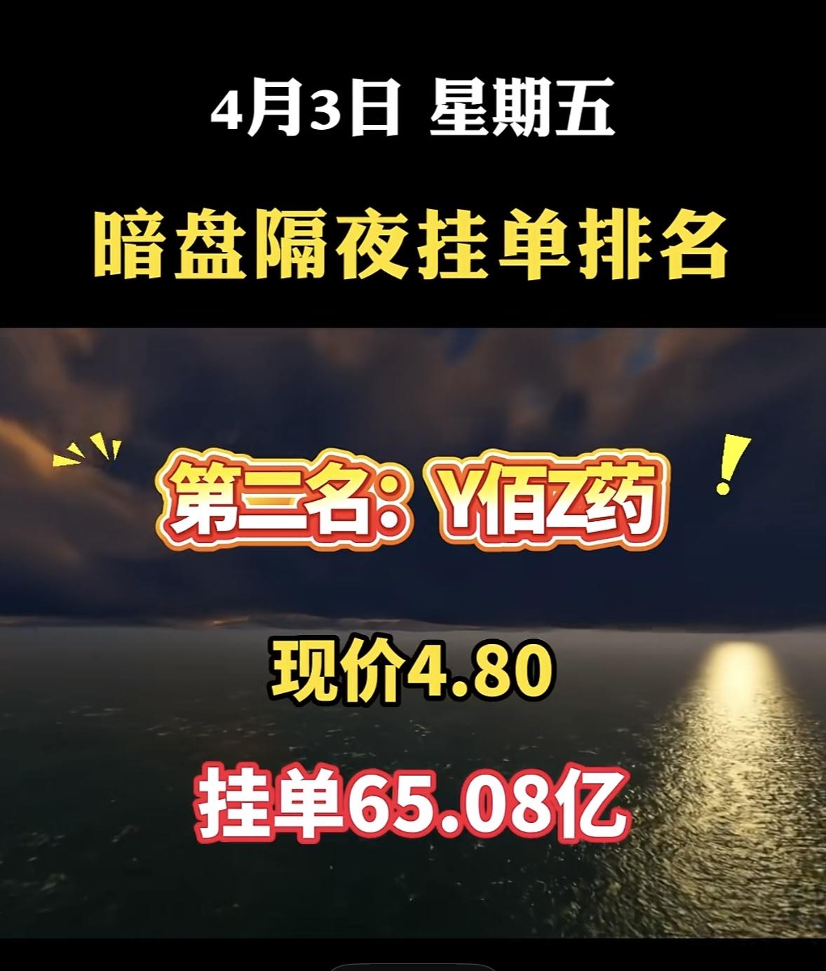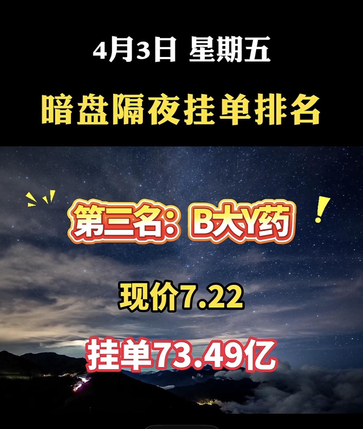 4月3日周五暗盘隔夜挂单排行榜出炉 4月3日双鹭药业可太猛了,以8.55的现价,挂单96.25亿,位列暗盘隔夜挂单排名第七!这数据一出来,估计不少股民都坐不住了。 再看看之前的表现,2026年这天它放量涨停,以5.98元开盘后一路走高,午后封死涨停板,报收6.61元,涨幅近10%,成交额3.72亿元。从技术面看,日K线收出光头光脚涨停阳线,突破所有短期均线压制。自1月底以来它震荡筑底,这次涨停算是打破了此前的局面。不知道后续它还能不能延续这波攻势,让我们拭目以待。