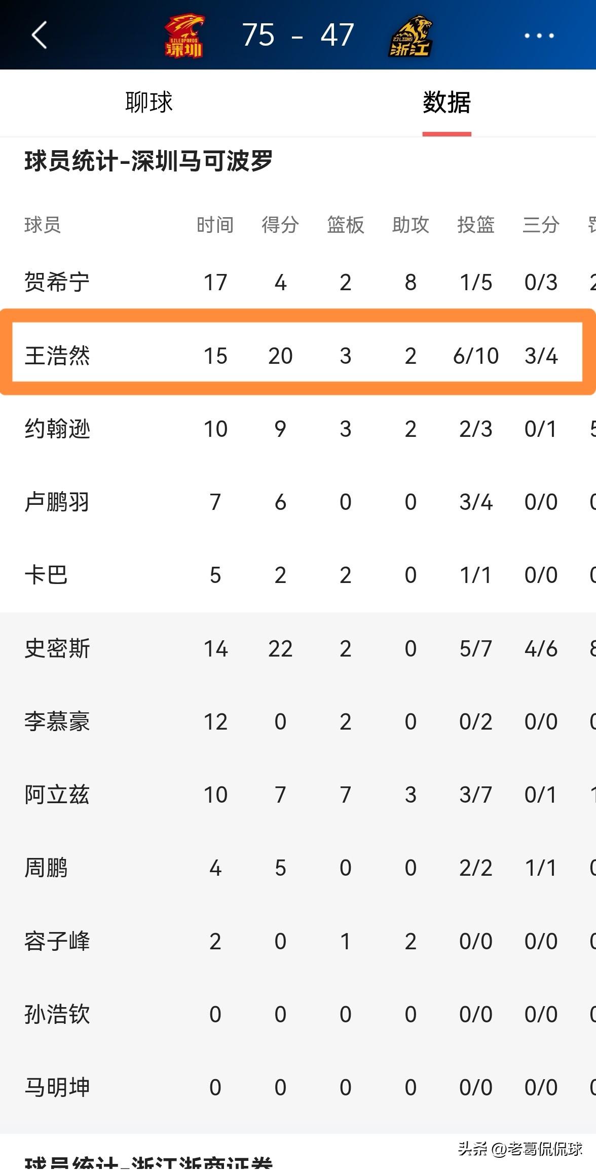 深圳马可波罗当红球星王浩然真是太出彩了!在今天深圳马可波罗主场迎战浙江浙商证券的比赛中,目前双方半场战罢,深圳马可波罗以75:47处于领先,形势看起来一片大好。值得注意的是,在前两节比赛中,王浩然在进攻端可谓是大放异彩。 在上半场比赛中,王浩然首发出战15分钟,投篮10中6,其中三分球4中3、罚球5中5非常高效的砍下20分,还有3篮板2助攻2抢断,他的场上正负值为球队并列最高的+27。 王浩然不愧是当今CBA的当红炸子鸡,他在上半场比赛中的表现完全就是超级巨星的表现。