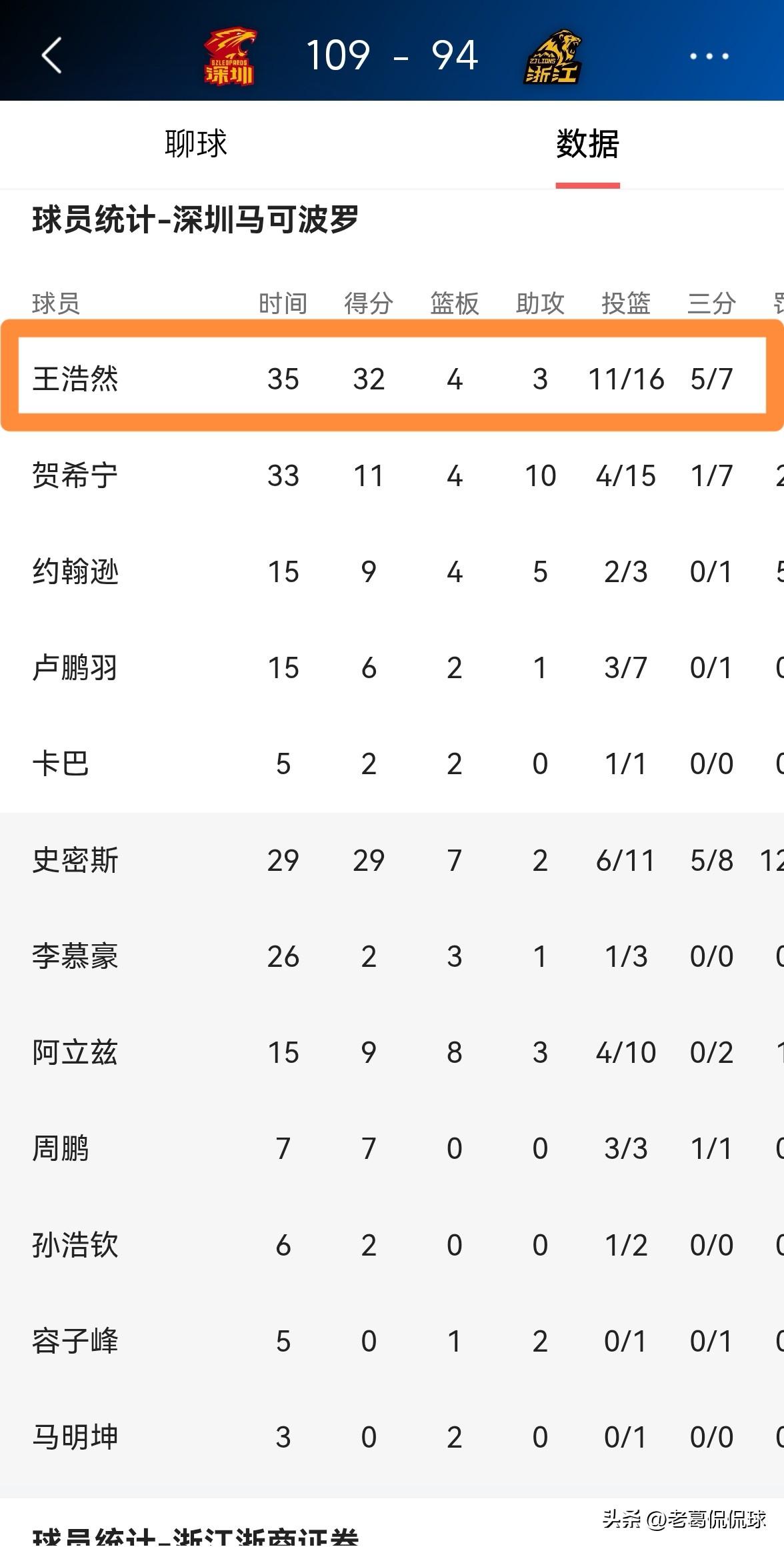 深圳马可波罗球星王浩然真是太不懂事了!在今天深圳马可波罗主场以109:94大胜浙江浙商证券的比赛中,王浩然面对缺兵少将的浙江浙商证券毫不留情爆砍32分,完全没有给对手留面子。 整场比赛下来,王浩然首发出战35分钟,投篮16中11,其中三分球7中5、罚球5中5轰下32分,外加4篮板3助攻2抢断,他的场上正负值为+14。 老实说,王浩然实在是太不懂事了,这让卫冕冠军浙江浙商证券情何以堪?