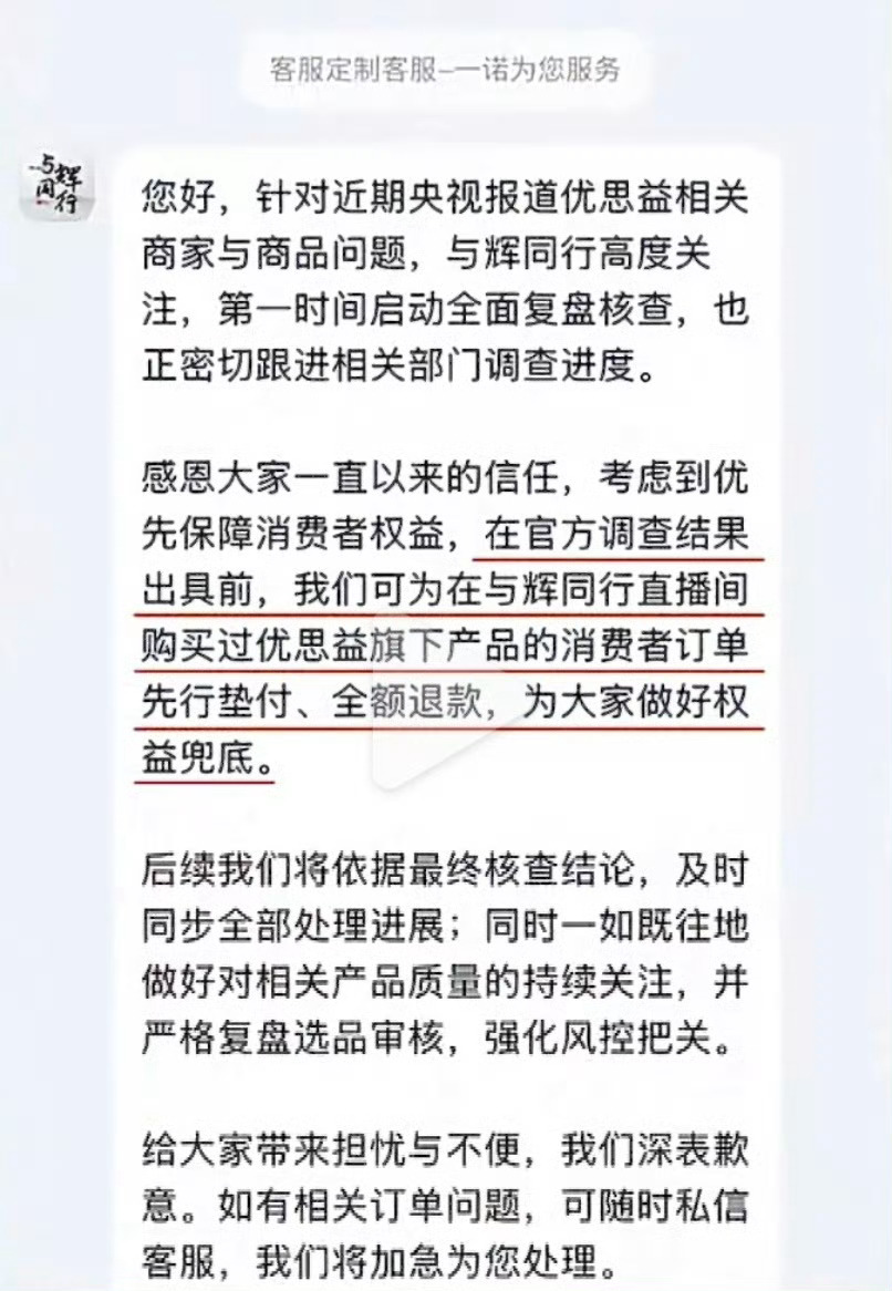 与辉同行致歉面对优思益这个假洋货,各个接触过的主播与明星都表达了歉意也给到了自己目前的处理办法!与辉同行目前给出来先行垫付、全额退款的方案,就是不清楚消费者会不会认可!选品这个问题,还是不能光听直播间的承诺,这么多明星、网红带货背书,还不是翻车了…
