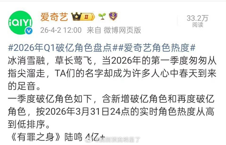 恭喜魏大勋《有罪之身》陆鸣成为爱奇艺2026Q1度角色热度TOP1!更是2026首位不分题材无任何限定词的破亿角色!!极限空降无预热零宣发,播出当天四小时破亿,演员魏大勋牛逼