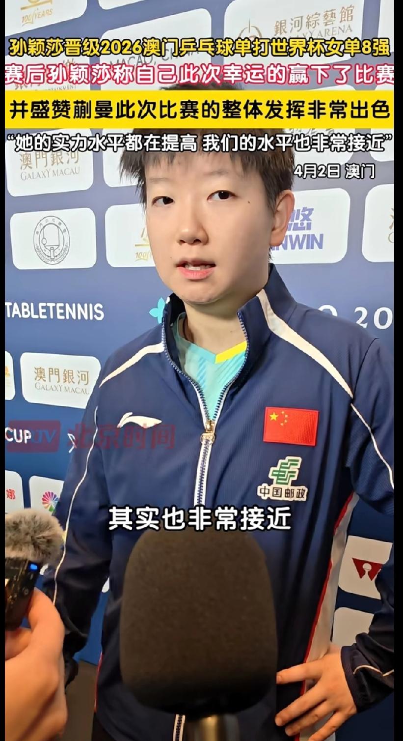 孙颖莎赛后采访太圈粉!4-2赢蒯曼,第一句话就夸对手 谁懂啊家人们!孙颖莎这情商真的绝了! 2026澳门乒乓球单打世界杯,莎莎4-2战胜蒯曼,顺利挺进女单8强。赛后采访一开口,直接把格局拉满! 她先说自己是“幸运赢下比赛”,转头就盛赞蒯曼发挥出色,直言“她的实力水平都在提高,我们的水平也非常接近”。还提到去年两人就在这个赛场打决赛,如今淘汰赛早早相遇,更是肯定了蒯曼的成长和进步。 没有一点世界第一的架子,全程先夸对手、再谈自己,谦逊又真诚,这格局谁看了不迷糊! 孙颖莎 澳门世界杯 赛后采访