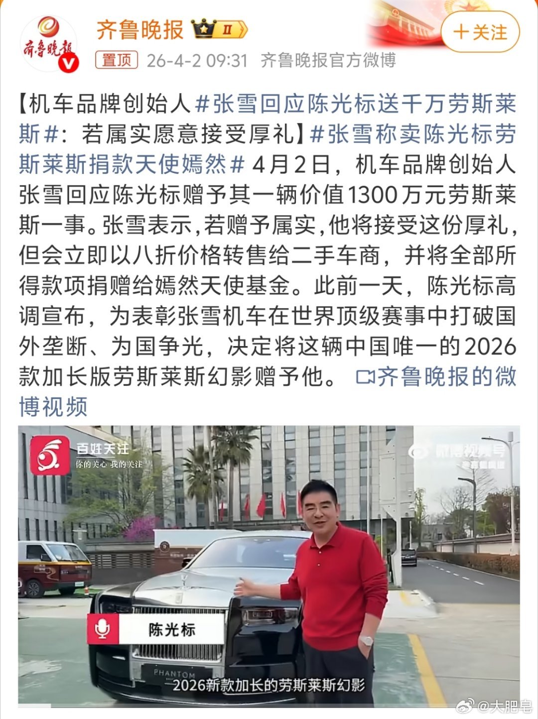 张雪称卖陈光标劳斯莱斯捐款天使嫣然 其实我要是张雪,他的车就收下来。然后我也不告诉他,然后这车我该怎么处理怎么处理,毕竟你送给我的嘛。我跟你也没什么过节,你想靠这个来蹭个热度,给你蹭了。蹭热度是要花钱的,你说说是不是?