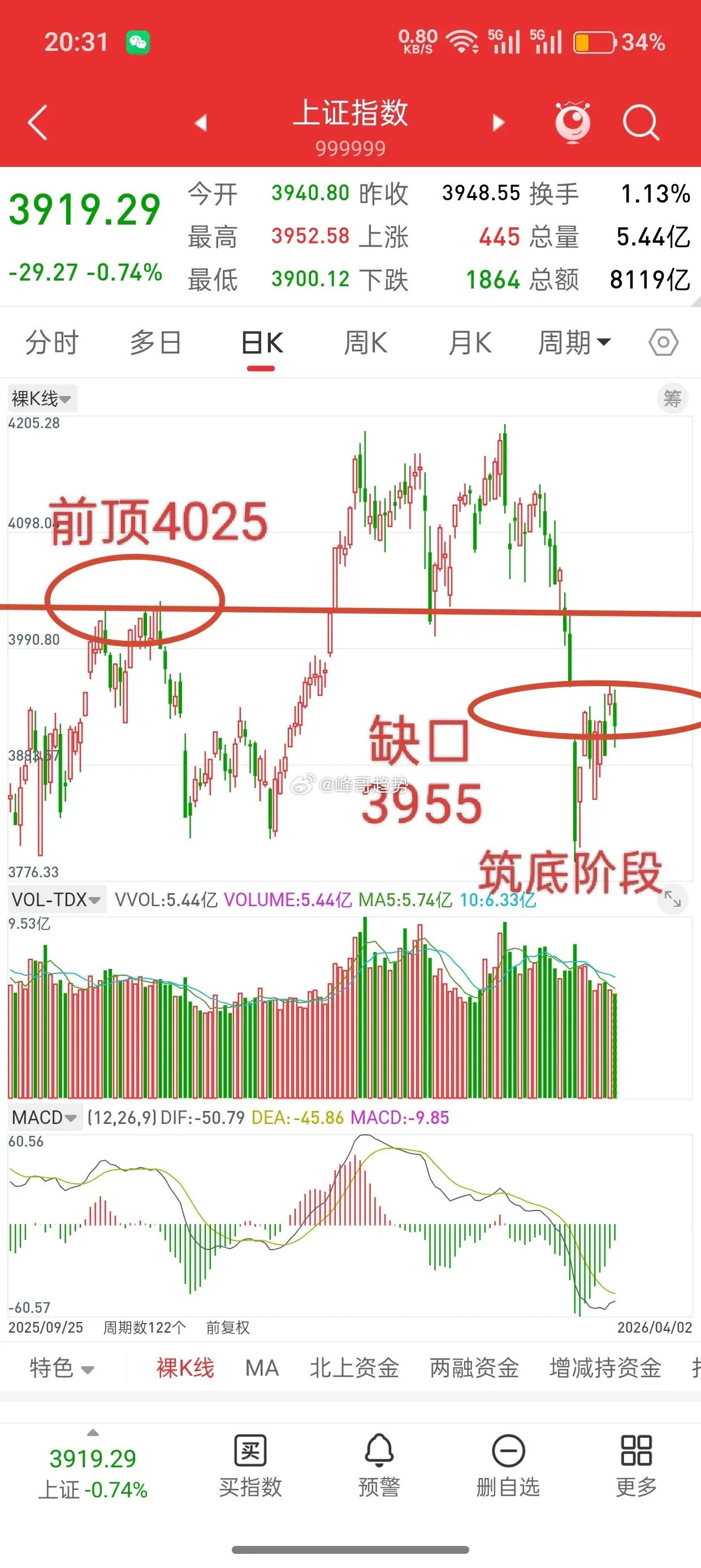 而今天也稍微破了下十月均线,这也是今天下午说3900附近是第一低吸位置,3850附近是第二低吸位置原因。