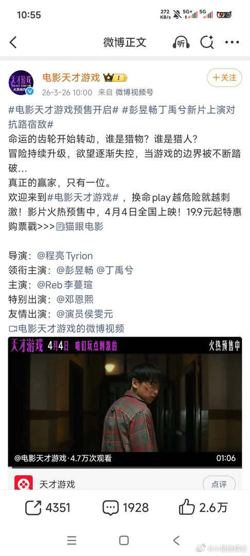 彭昱畅丁禹兮新片预测票房4500万天才游戏积压多年品质待检验4月4日,由程亮执导