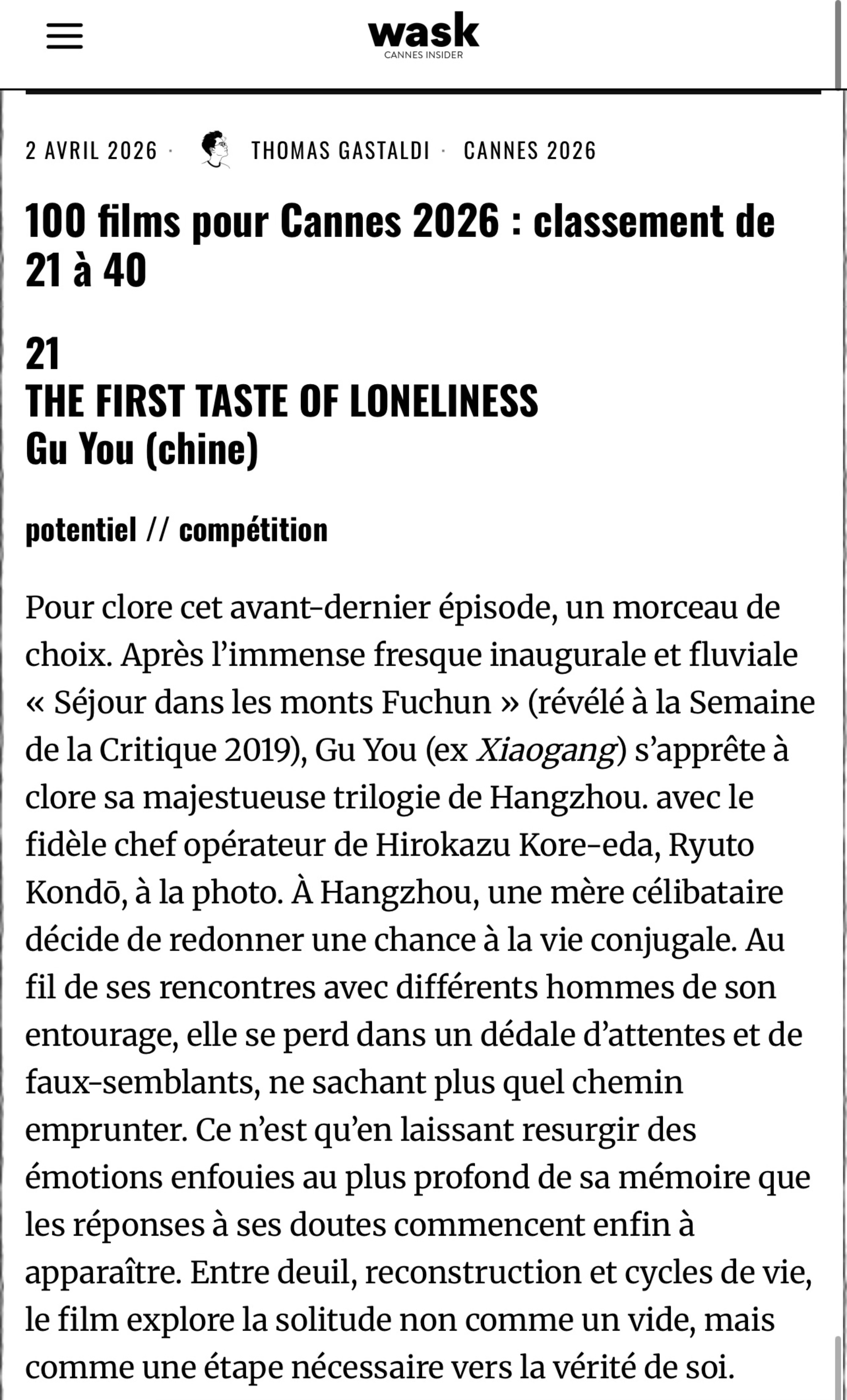 WASK刚刚发布100部第79届戛纳电影节入围片单(21-40),顾游执导,周迅、奚美娟、王圣迪、周一围、穆祉丞主演的新片《初次尝到寂寞》被提及并预测会入围本届戛纳主竞赛单元。这是目前为止唯一一家预测这个结果的媒体。
