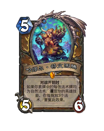 旧:对战开始时: 如果你套牌中的每张法术牌均为自然法术,灌注你的英雄技能。你每施放2个法术,重复此效果。新:对战开始时: 如果你套牌中的每张法术牌均为自然法术,灌注你的英雄技能。你每施放3个法术,重复此效果。