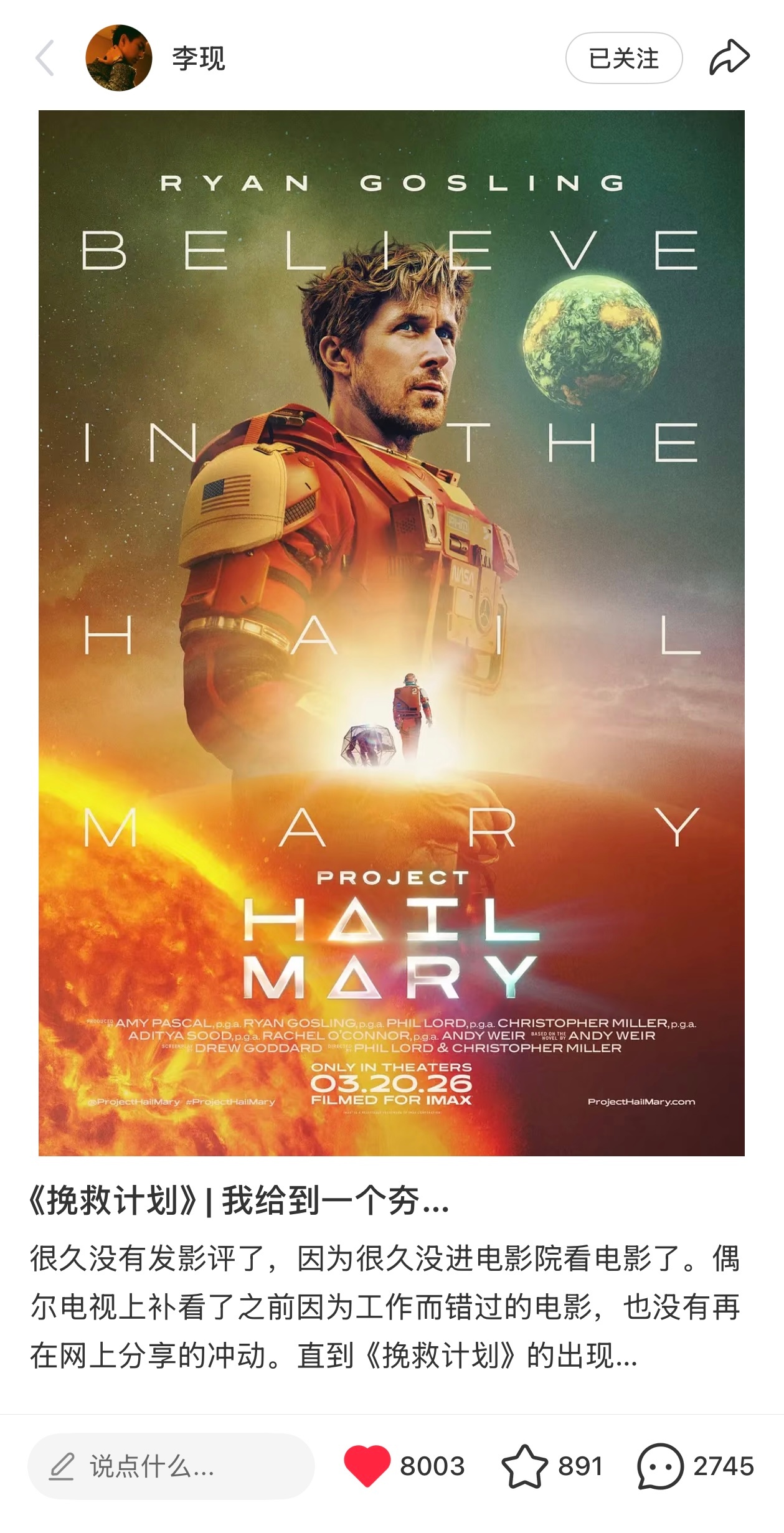 李现发🍠给到《挽救计划》一个夯,很认真的写影评推荐了这部电影,久违的电影博主小李上线