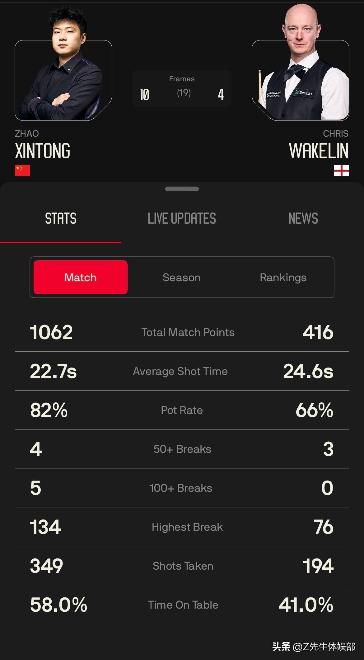 赵心童以10-4大胜克里斯·韦克林,距离完成“球员系列赛”三连冠只差两场胜利。