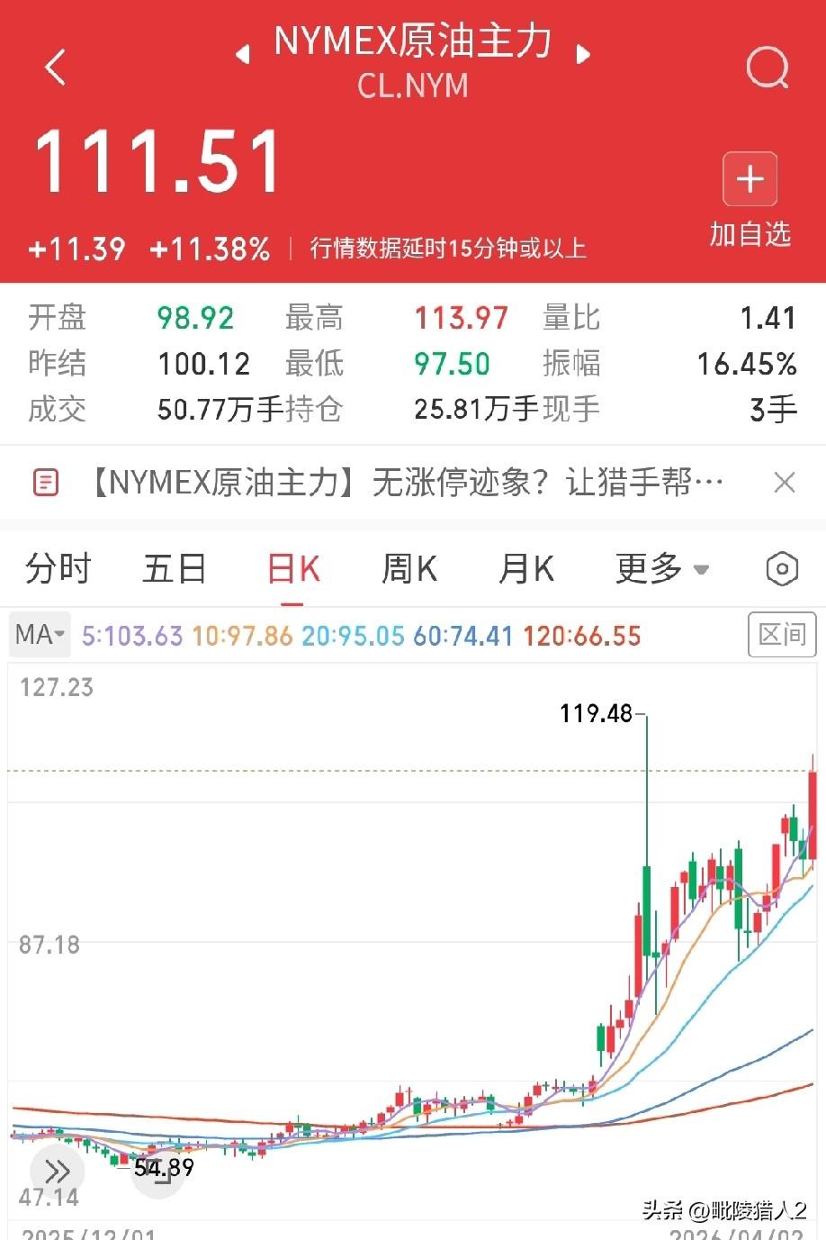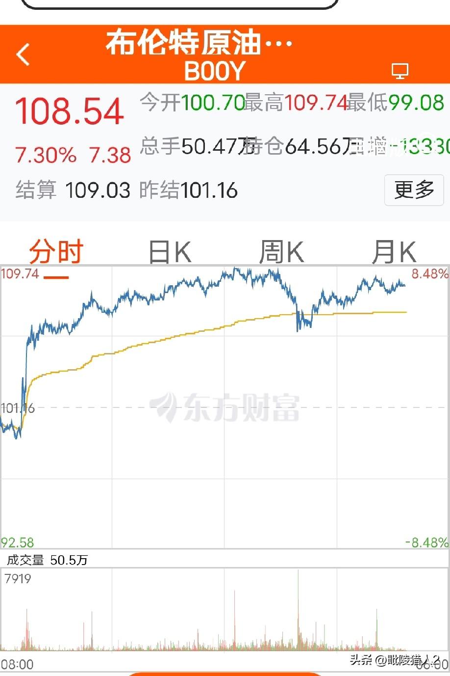 我前面讲过,货能否运出霍尔木兹海峡是一回事,价格是另一回事,油气减产大家都知道,而且特朗普扬言后面两周还要加大对伊朗的攻击力度,所以能买到油已经是感谢伊朗祖宗十八代的事情了,议价就免了。因此隔夜布伦特原油和NYMEX原油主力依旧价格飙涨,双双接近110美元/桶(图3、4)。大家可以看到最近普京连额头的皱纹都少了几根!