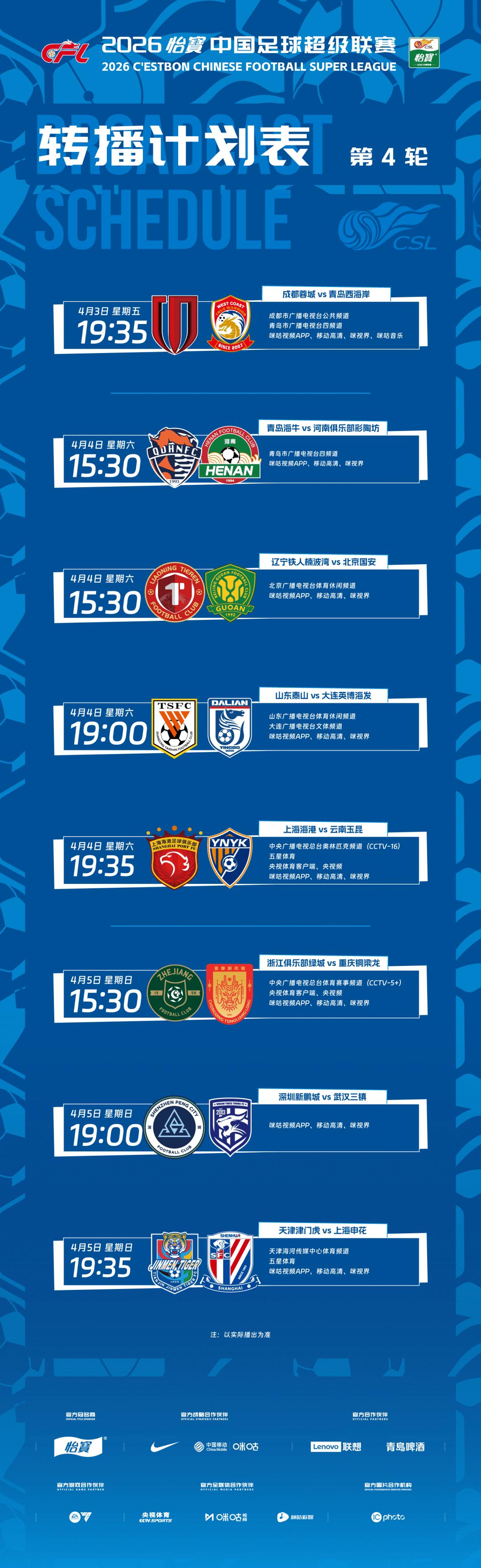 中超联赛第4轮转播计划表!休整多日的2026中超联赛战火重燃,第四轮赛将于4月3——4月4日全面展开。其中领头羊成都蓉城主场对阵青岛西海岸的比赛率先打响,未尝败绩的成都蓉城将继续自己的连胜脚步。中央电视台将现场直播上海海港VS云南玉昆、浙江俱乐部绿部VS重庆铜梁龙的比赛。山东泰山主场对阵大连英博的比赛,将于本周六晚上19:00进行,欢迎届时为山东泰山加油助威!