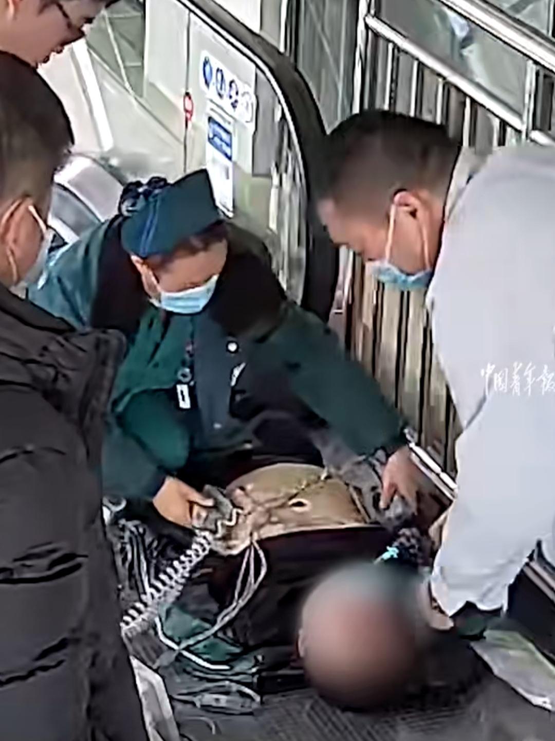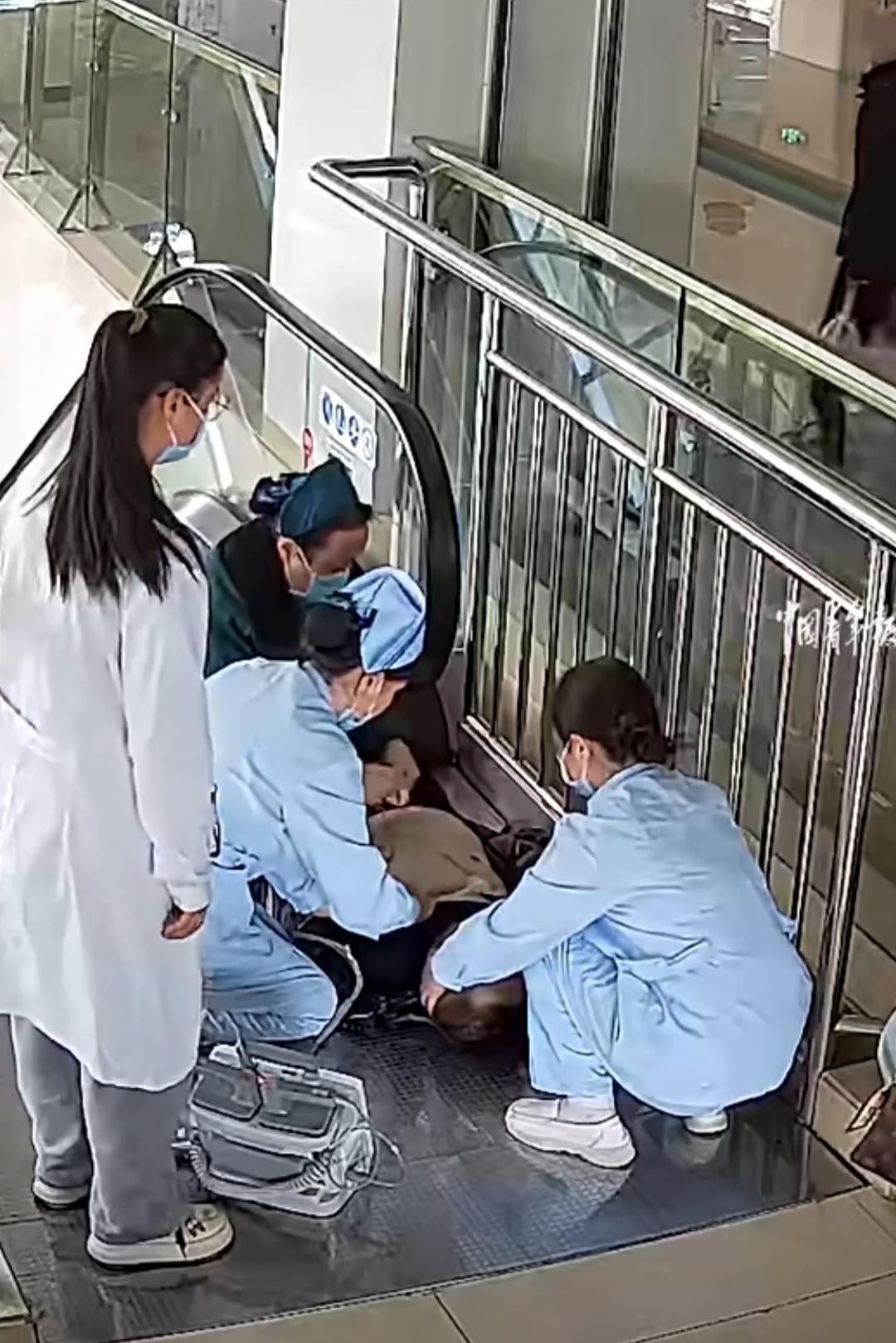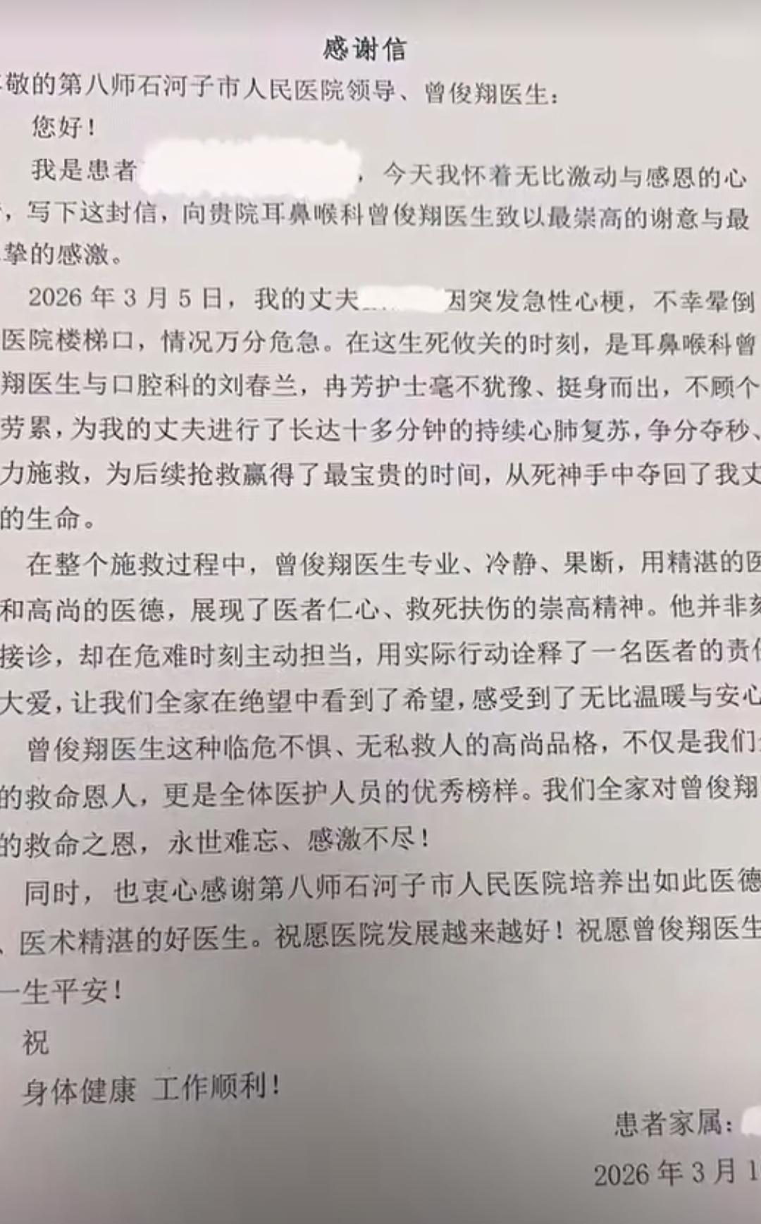 “快!快过来帮忙!”2026年3月5日,新疆石河子某医院扶梯口,一声急促呼喊打破了走廊的平静。一名中年男子突发心梗,毫无征兆地摔倒在扶梯口,瞬间失去意识,脸色瞬间苍白如纸。 监控画面里,情况危急万分。男子蜷缩在扶梯台阶上,呼吸微弱,生命体征急速下降。就在这生死攸关的时刻,耳鼻喉科医生曾俊翔、口腔科医生刘春兰与护士冉芳,恰好路过此地。没有丝毫犹豫,三人立刻冲上前,跪在冰冷的扶梯台阶上,展开了一场与死神的极速赛跑。 “准备按压!”曾俊翔医生率先俯身,双手交叉按压在男子胸口,一下、两下、三下……每一次按压都精准而有力,额头上的汗水顺着脸颊滑落。刘春兰与冉芳护士默契配合,迅速清理呼吸道、准备急救设备,三人分工明确,争分夺秒地进行心肺复苏。 长达十多分钟的持续施救中,他们全然不顾自身劳累,也顾不上扶梯旁往来的人群,眼里只有患者微弱的心跳。心电监护仪上的数据一度触底,可医护人员从未放弃,每一次按压都倾注着生的希望。终于,在众人的接力抢救下,男子逐渐恢复了自主呼吸,生命体征慢慢趋于稳定。 随后,急救人员赶到,将男子紧急送进抢救室。事后,患者写了感谢信还让家属送来锦旗,字字滚烫:“临危施救,起死回生;救命之恩,终生铭记。”家属哽咽着说,要不是三位医生护士的果断出手,家人可能就再也回不来了。 这一幕,让无数网友破防:“这就是白衣天使的使命!”“平凡的岗位,做着最伟大的事!” 在医院这样的公共场所,突发意外的风险无处不在。这起救援事件,不仅展现了医护人员精湛的急救技能,更彰显了他们“敬佑生命、救死扶伤”的医者仁心。医护人员 施救