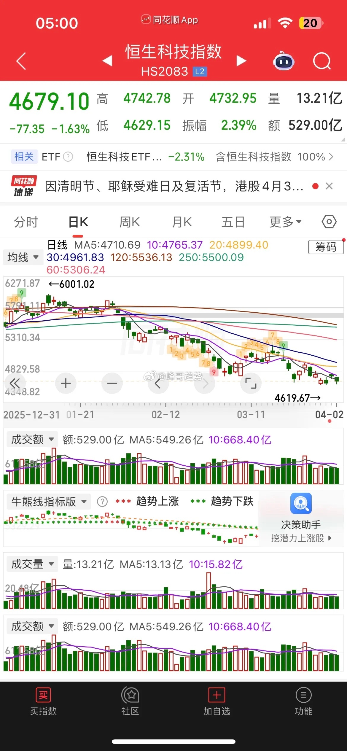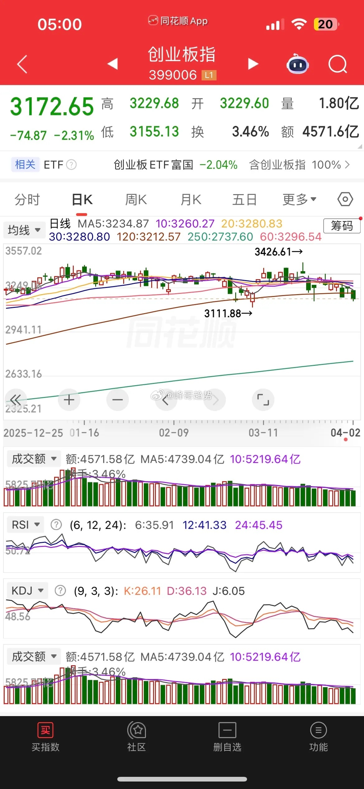 昨天市场全线杀跌,沪指险守5日均线,创业板指跌逾2%,科创50跌近3%,各均线呈现向下发散形态,短期看若未能及时修复,很容易步入下降通道,昨天两市缩量1600多亿,目前总成交额维持在1.8万亿左右,说明资金依旧偏谨,观望情绪浓厚,板块上昨天油气,猪肉、医药逆势活跃,而另一边前期活跃的算力租赁、半导体、Al应用、贵金属全线领跌,目前看在外围风险偏好较低的背景下,医药、银行煤炭等防御避险资产成为资金抱团的主要方向,而一旦外围缓和,原油回落,超跌的成长赛道依旧是资金的首选,所以还是尽量守好自己手中的标的少折腾。