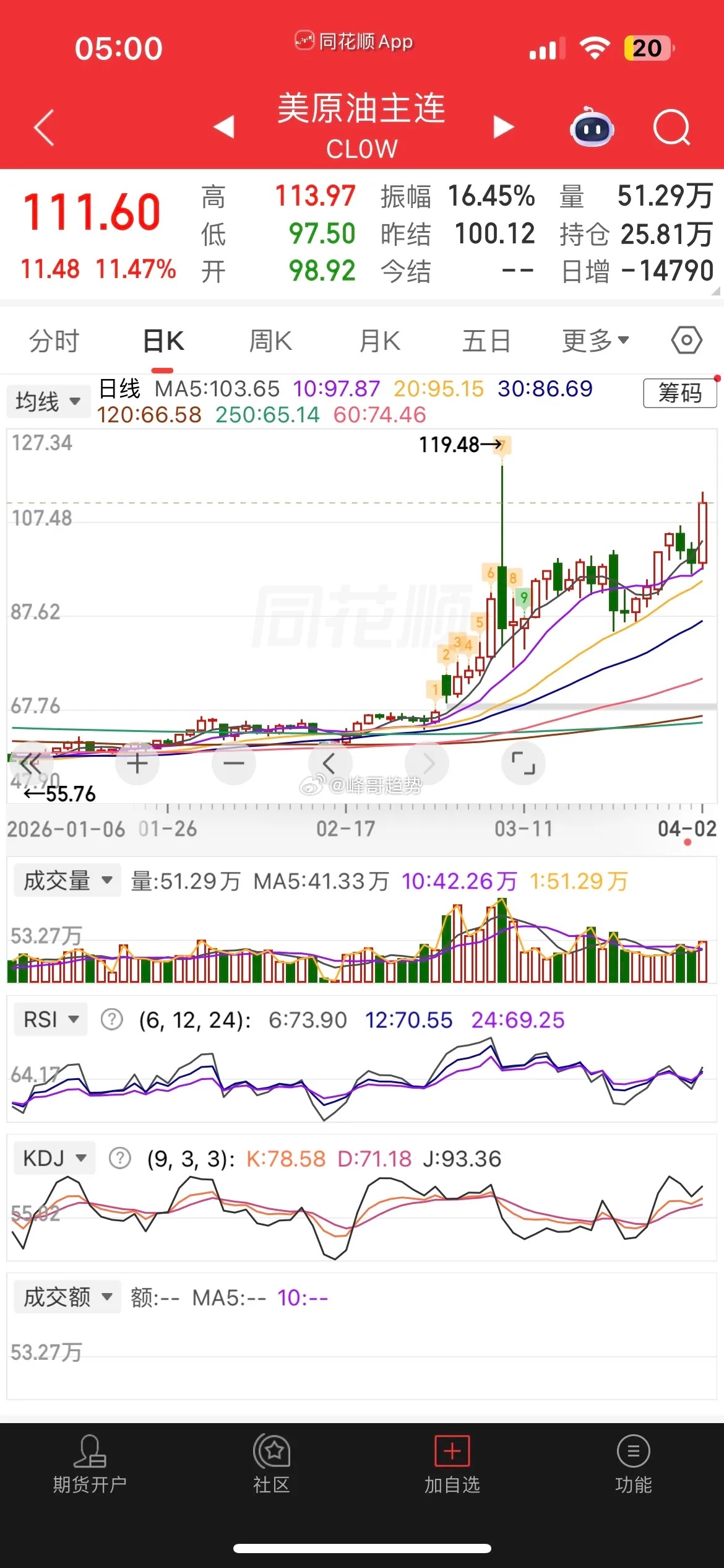 一觉醒来,美原油暴涨超11%,美股深V反攻,现货黄金大跌超2%,白银大跌超4%,热门中概股普跌,纳指金龙指数跌0.34%,阿里、京东跌逾1%,百度跌0.84%,哔哩涨0.7%,拼多多跌0.89%,阿特斯太阳能跌逾2%,小鹏涨超1%,蔚来大近2%,富时A50涨0.6%,恒生主连涨0.5%,这样看今天我们市场会迎来小幅高开,有望反包昨天的失地,而港股因复活节,今天休市。