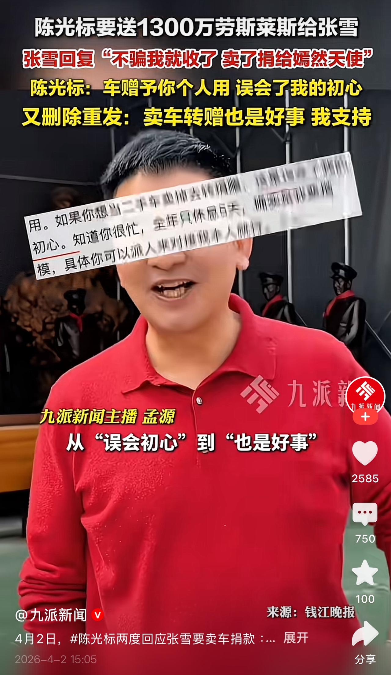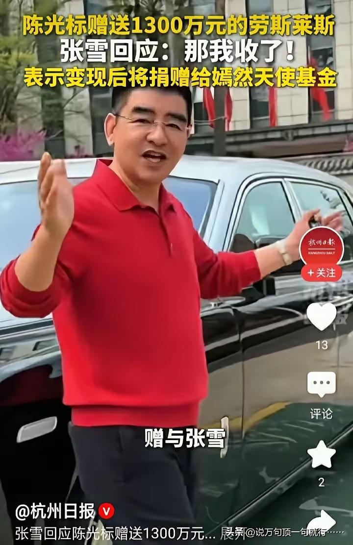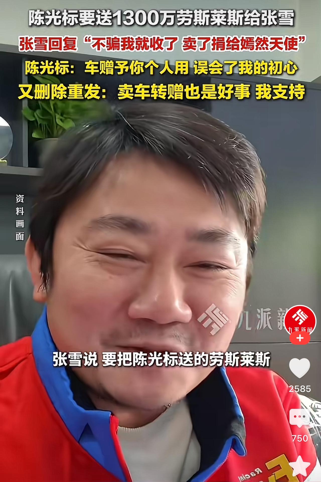 陈光标果然是商业奇才,他这次倘若真的将劳斯莱斯赠给张雪,然后张雪真的将车二手卖掉,钱款都捐给嫣然天使基金,那么这件事所造成的轰动效应肯定是会远远大于1300万本身的! 这件事后续就看张雪接不接这个烫手山芋了,现在就是谁先下车谁输,继续下去张雪也挺尴尬的,怎么样陈光标都是赢家!再后面,这个天使基金这钱收还是不收啊?这对于老好人李亚鹏估计也是个难题!这情节想起了不差钱里面小沈阳问赵本山:这有还是没有?李亚鹏没办法只好私底下问陈光标:这钱我是收还是不收? 事情发展到现在,最好找个策划人,好好把这事情继续下去,弄好了三方都是赢家!弄不好,大家都挺尴尬的!