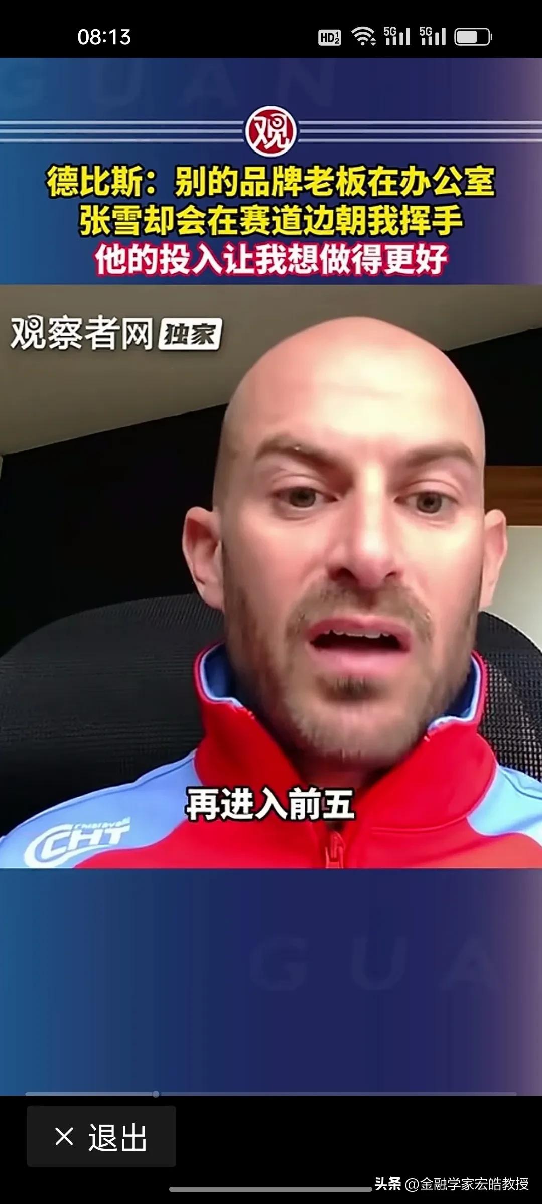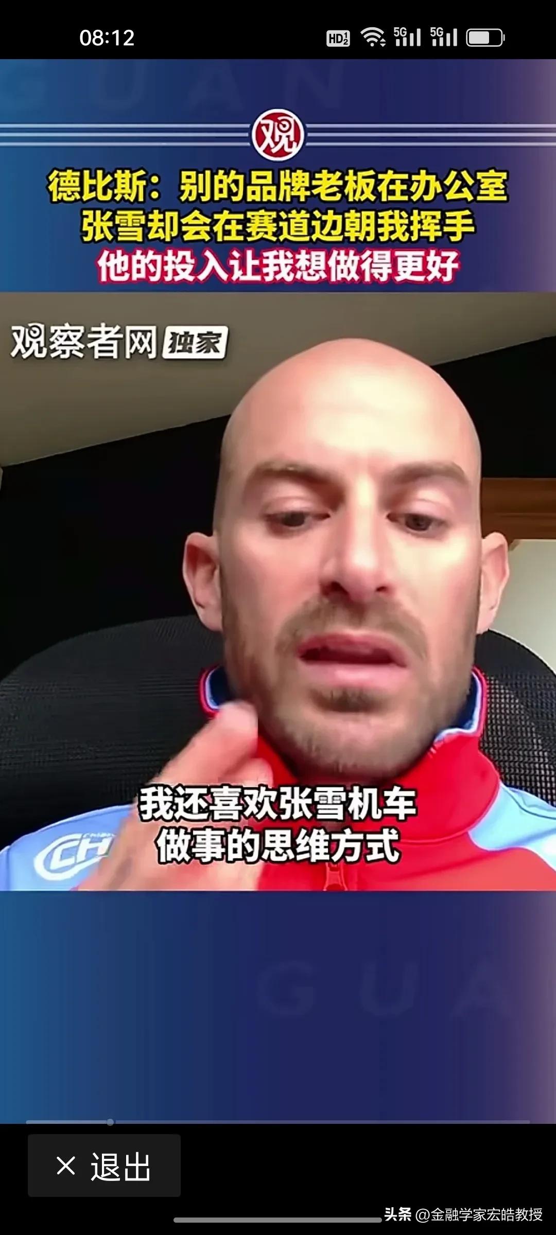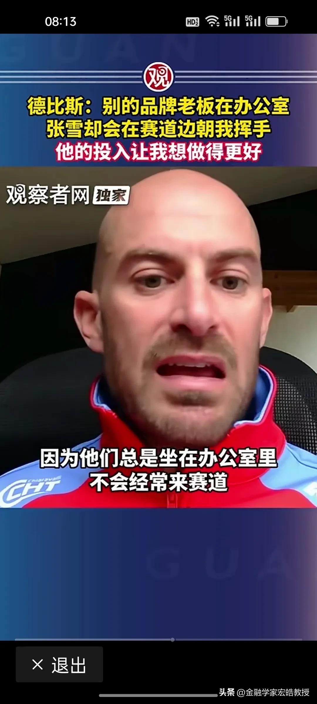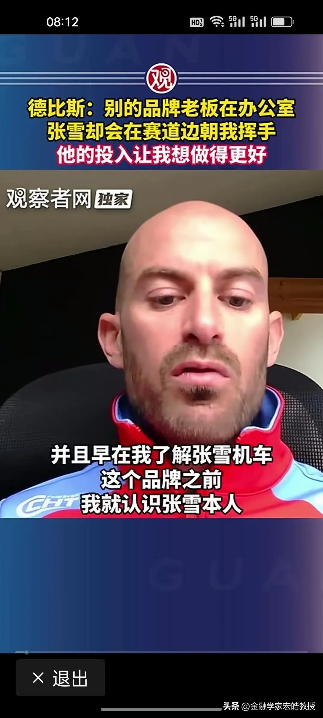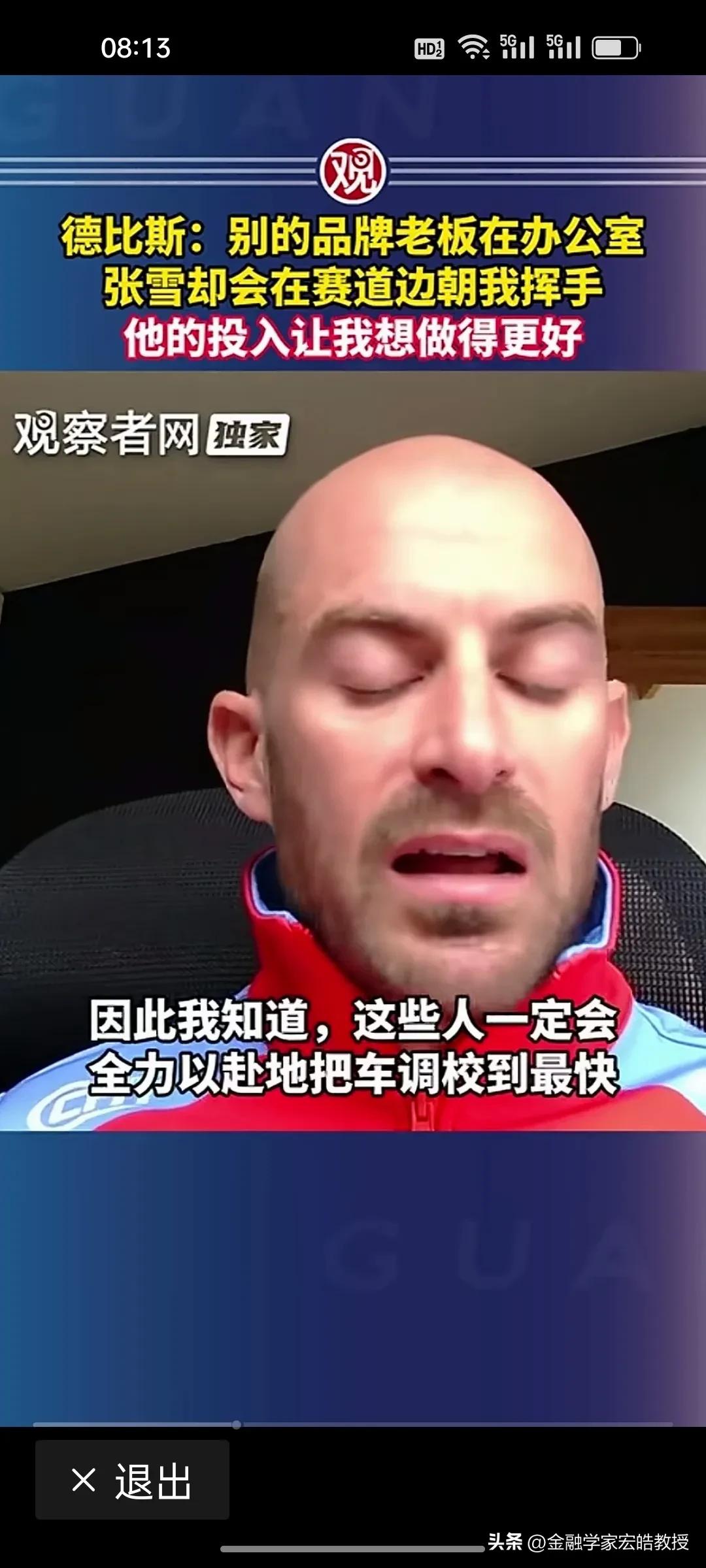 34岁的法国冠军车手德比斯在接受采访中全程不邀功,不说自己的车技有多高超,直言车好、团队好、老板更拼,还夸赞张雪全程守在赛道、不像其他老板,只待在办公室,张雪从不急功近利,就是循序渐进,不给车手压力,张雪一心为团队,句句都在成就老板,低调又通透。
