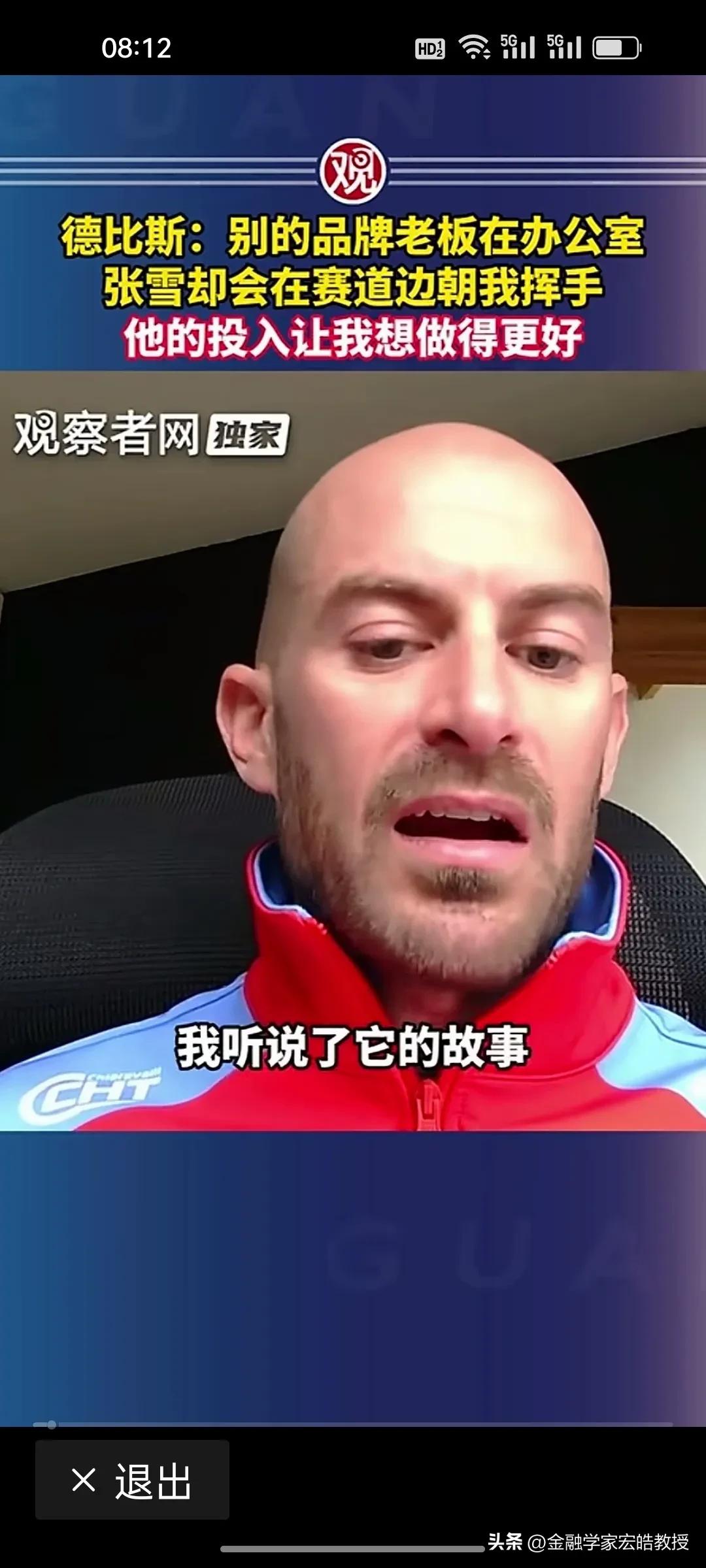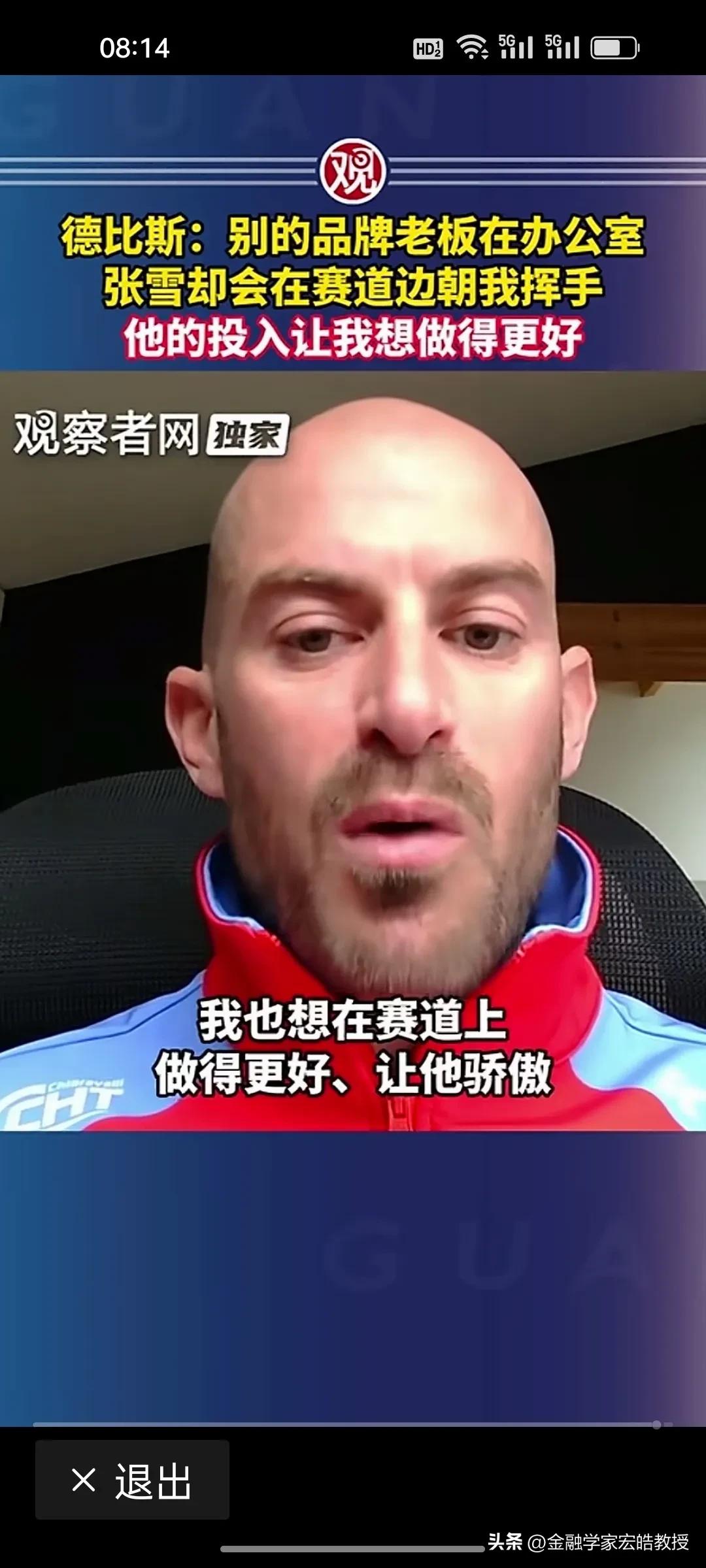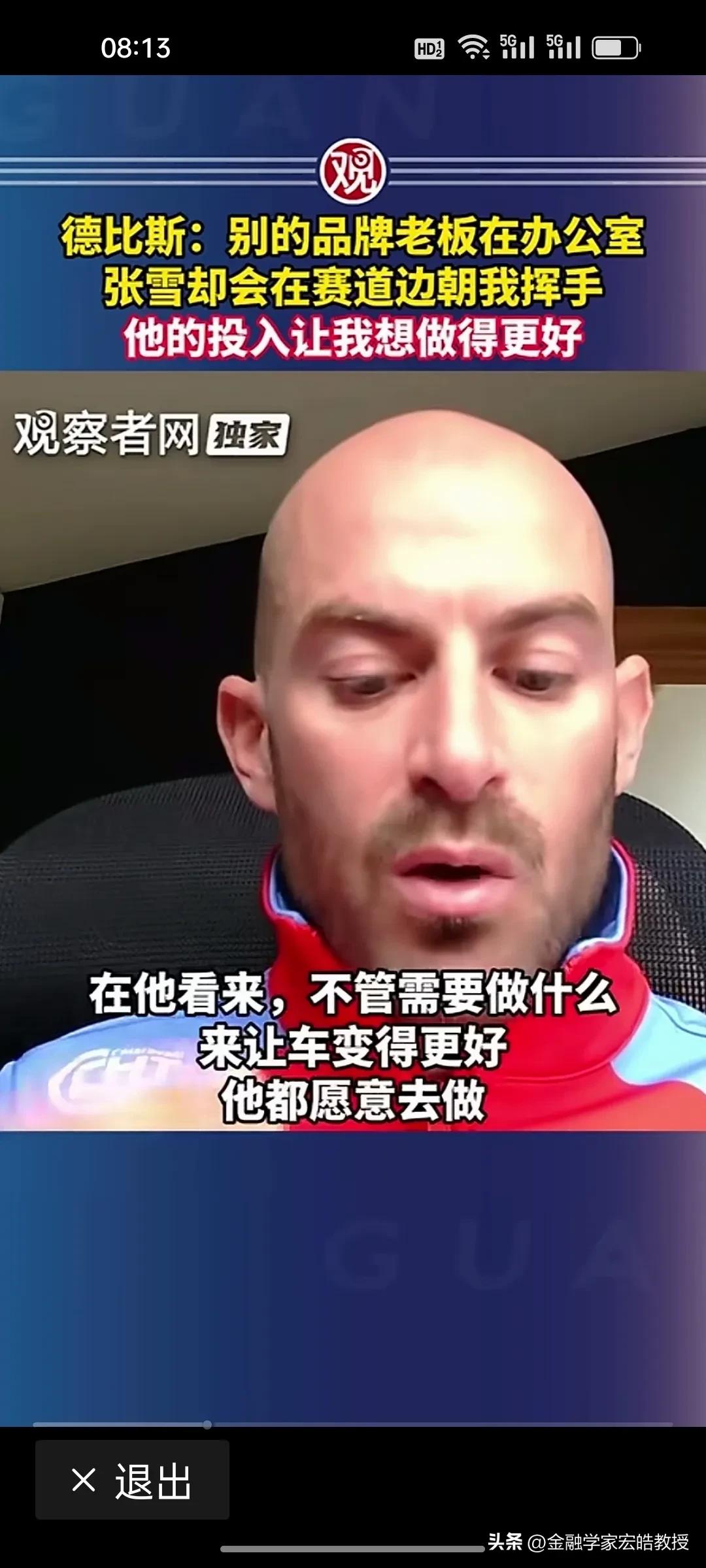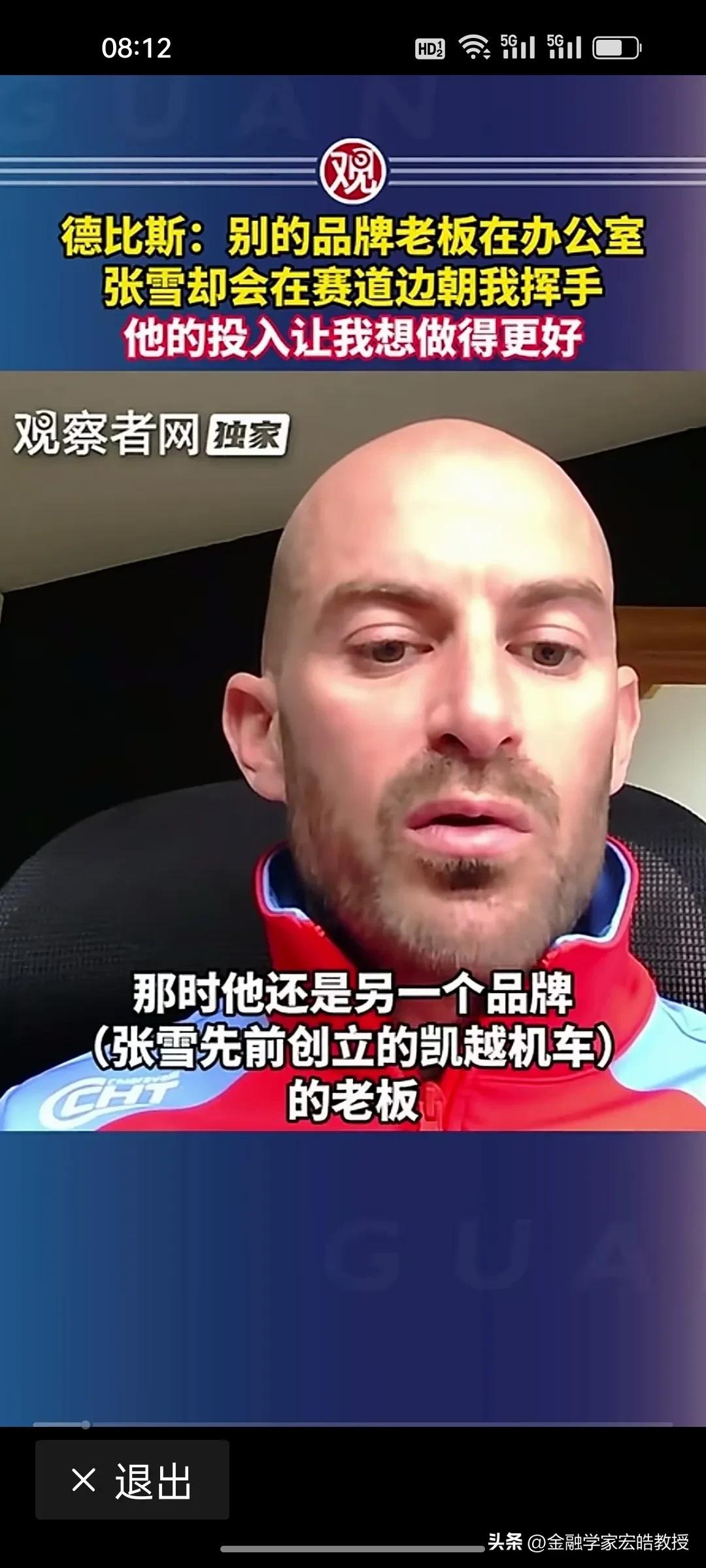 34岁的法国冠军车手德比斯在接受采访中全程不邀功,不说自己的车技有多高超,直言车好、团队好、老板更拼,还夸赞张雪全程守在赛道、不像其他老板,只待在办公室,张雪从不急功近利,就是循序渐进,不给车手压力,张雪一心为团队,句句都在成就老板,低调又通透。