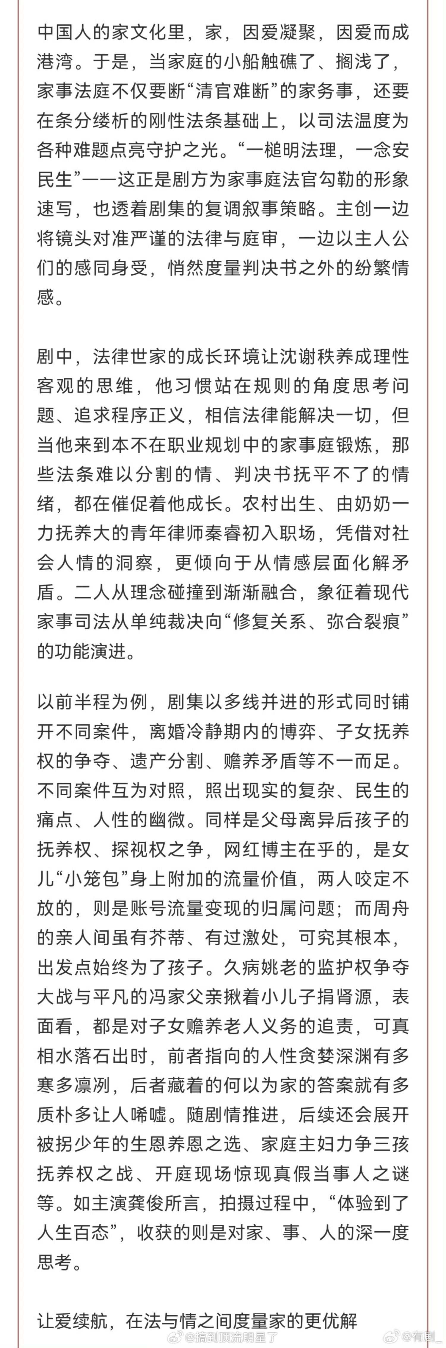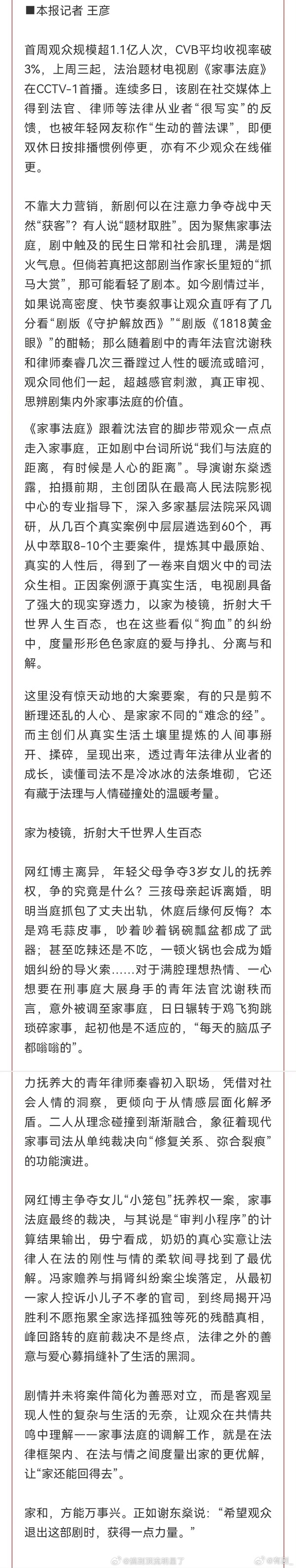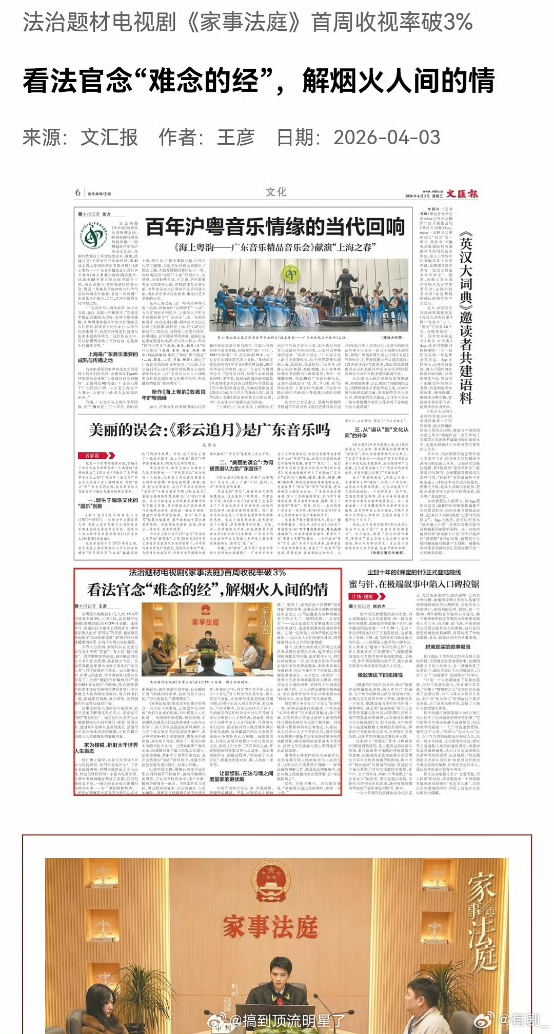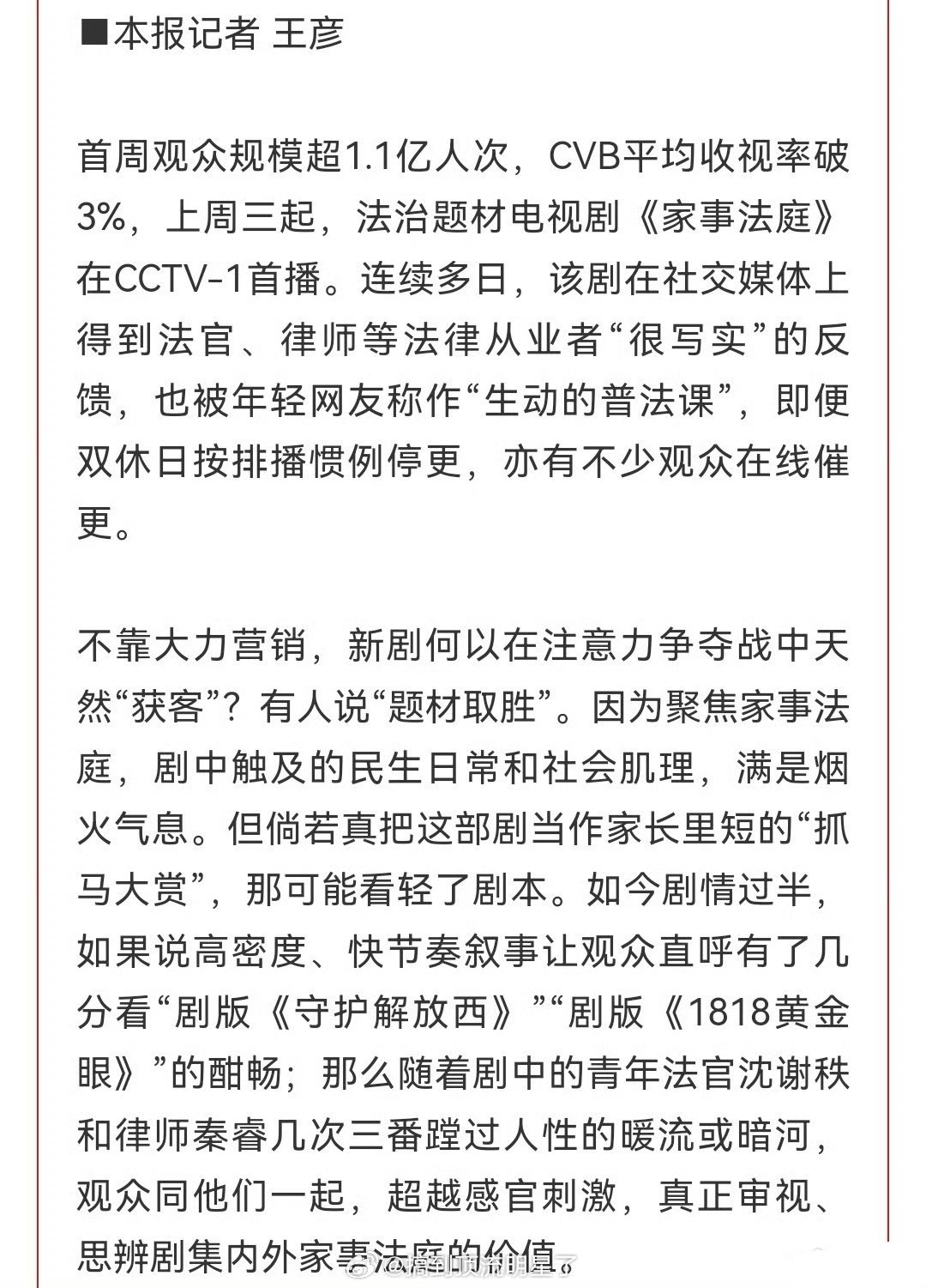 文汇报报道了龚俊《家事法庭》,首播观众破1.1亿,收视破3,不靠大力营销,用高密度快节奏的叙事让观众直呼有了看剧版《守护解放西》和《1818黄金眼》的感觉。每一个案件都客观呈现人性的复杂和生活的无奈,让观众在共情共鸣中理解家事法庭的调解工作。很优秀的一部法治题材职业剧家事法庭