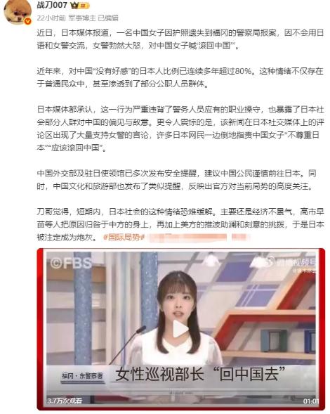 近日,日本媒体报道,一名中国女子因护照遗失到福冈的警察局报案,因不会用日语和女警交流,女警勃然大怒,对中国女子喊‘滚回中国’”。 近年来,日本社会对华负面情绪持续蔓延,相关数据显示,对中国“没有好感”的日本人比例已连续多年超过80%,这种情绪不仅存在于普通民众中,更渗透到部分公职人员群体。 近期,日本福冈一处警务站发生的涉外冲突,便赤裸裸暴露了这种偏见与敌意。 一名常年在日打拼的中国女子,因遗失护照前往警局求助,仅因日语沟通不畅,就遭到执勤女警“滚回中国”的辱骂。 据悉,该女子在家中遗失护照后十分焦急,护照作为异国人士唯一合法身份凭证,遗失后无法入住酒店、乘坐交通,更难以顺利离境,因此她第一时间前往就近警务站,希望获取报案证明以补办证件。 抵达警务站后,窗口职员得知其护照可能遗失于家中,便建议其先回家寻找,这一常规建议在急于办证明的女子眼中,被解读为“踢皮球”。 因双方语言不通,无法清晰传递诉求,沟通迅速陷入僵局,女子情绪激动之下,不慎扯坏了桌上的表格。 随后前来协调的女警,未采取任何安抚措施,也未启动翻译协助流程,反而因沟通无果的焦躁情绪彻底失控,对着女子吼出“滚回中国”的歧视性话语,让一次普通求助演变成带有国别歧视的对峙。 事件曝光后,日本舆论呈现明显分裂。 部分日本媒体直言,涉事女警的言行违背警务人员职业操守,暴露了日本社会对中国公民的偏见。 但日本社交媒体上,却有大量网民支持涉事女警,指责女子“不尊重日本”,这一现象更凸显出当地对华负面情绪的普遍性。 深层来看,这种负面情绪的蔓延,与日本国内经济不景气密切相关,部分政客刻意将发展困境归咎于中国,加之美方推波助澜、挑拨中日关系,导致相关情绪短期内难以缓解。 同时,此次冲突也暴露了日本涉外公共服务的短板:福冈作为热门旅游城市,入境外籍人士逐年增多,但基层警务站缺乏专职翻译,警员未接受过跨文化沟通培训,面对语言障碍极易处置失当。 类似的涉外冲突并非个例,去年,一名中国游客在韩国济州岛遗失物品后报案,因不会韩语沟通不畅,遭到值班警员辱骂“不会韩语就别来韩国”,最终在中国驻济州总领馆介入下,涉事警员被处分。 两起事件均因语言壁垒、服务缺位和国别偏见引发,凸显部分国家涉外服务的不足。 事件发酵后,多方迅速回应。中国驻福冈总领馆第一时间介入,联系当事人核实安全、跟进证件补办,并向日方交涉,要求严肃查处涉事女警、保障在日中国公民权益。 中国外交部及文化和旅游部也再次发布赴日安全提醒,建议公民谨慎前往。 福冈当地警署随后确认涉事女警言行属实,已启动内部调查,明确将依据相关条例处分;涉事女警也承认因沟通障碍失控,事后已反省。 与此同时,女子的家人赶到警局将其劝离,事件暂时告一段落。 对于出境中国公民而言,境外遗失证件后需保持冷静:第一时间报案留存凭证,联系使领馆咨询补办流程,同时提前备份护照信息、留存使领馆电话,避免因情绪过激陷入被动。 而日本作为高度依赖入境旅游的经济体,亟需补齐服务短板,增加专职翻译、加强警员培训,摒弃偏见,才能赢得国际认可。 这场看似偶然的冲突,本质是日本公共服务国际化与实际需求不匹配的体现。 一句辱骂不仅伤害了当事人,也损害了日本警务部门的形象,更提醒各国重视涉外服务质量,摒弃偏见,同时也为出境公民敲响了安全与维权的警钟。 如果各位看官老爷们已经选择阅读了此文,麻烦您点一下关注,既方便您进行讨论和分享,又能带来不一样的参与感,感谢各位看官老爷们的支持!