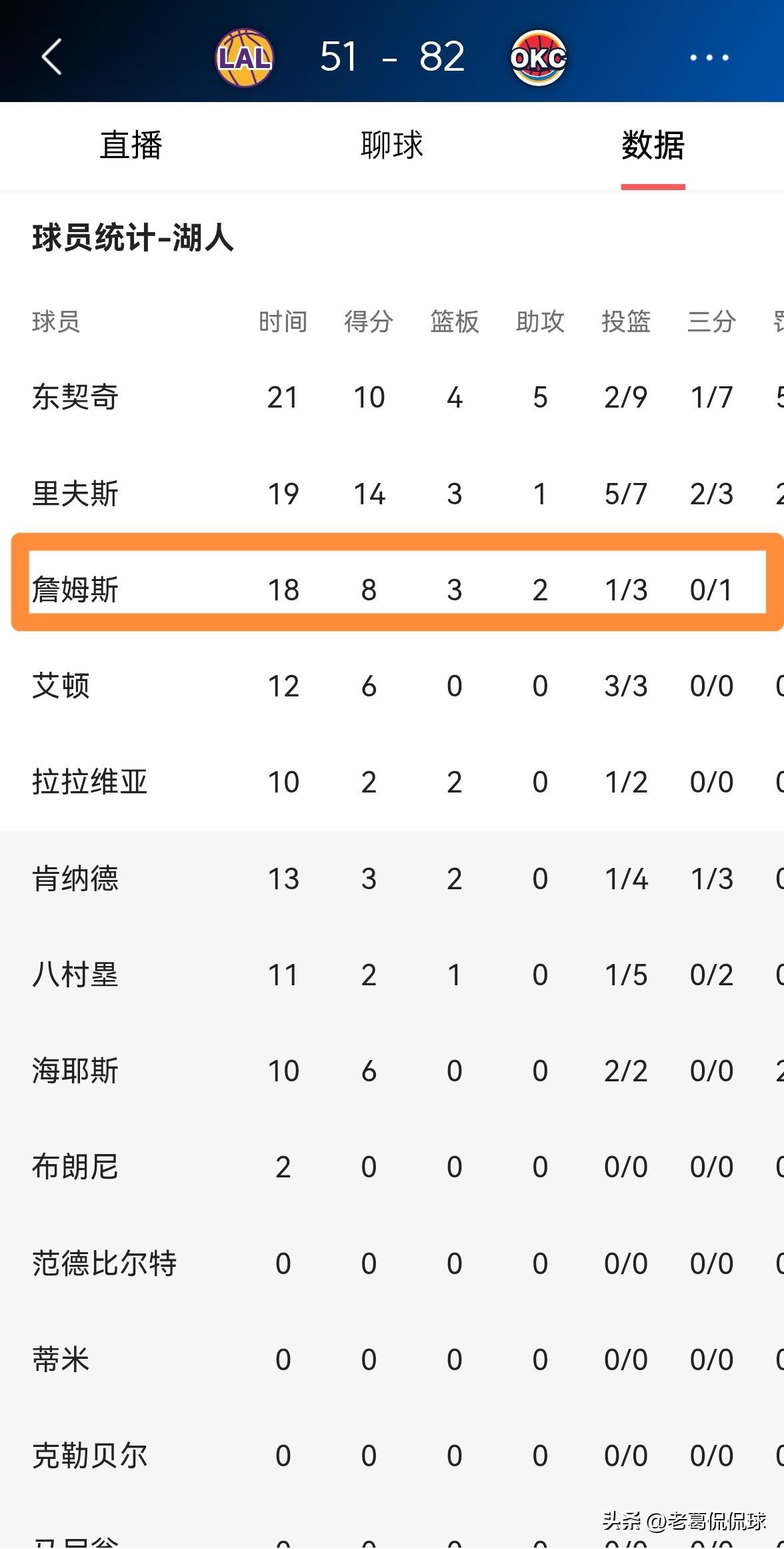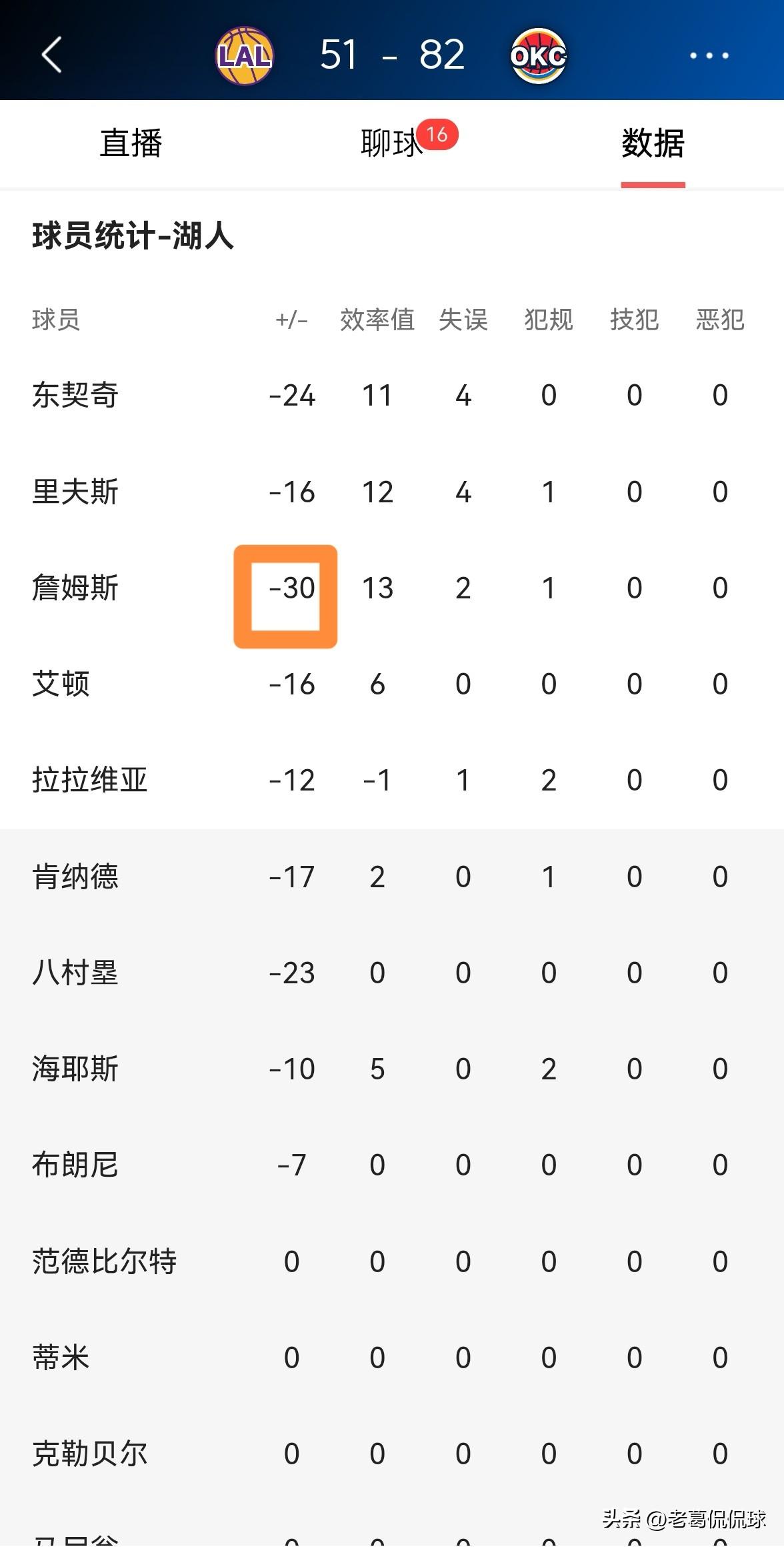 湖人超级巨星詹姆斯真是太想赢球了!在今天湖人客场挑战雷霆的比赛中,目前双方半场战罢,虽然湖人以51:82落后对手31分,但是詹姆斯在攻防两端都拼尽全力,詹姆斯是湖人阵中最想赢球的球员之一。 在前两节比赛中,詹姆斯首发出战18分钟,投篮3中1,其中三分球1中0、罚球8中6得到8分3篮板2助攻,不过有2次失误,他的场上正负值为全队最低的-30。 说实话,对于詹姆斯在上半场比赛中的场上正负值,我是百思不得其解,詹姆斯在如此玩命的情况下,他的场上正负值怎么会这么低呢?