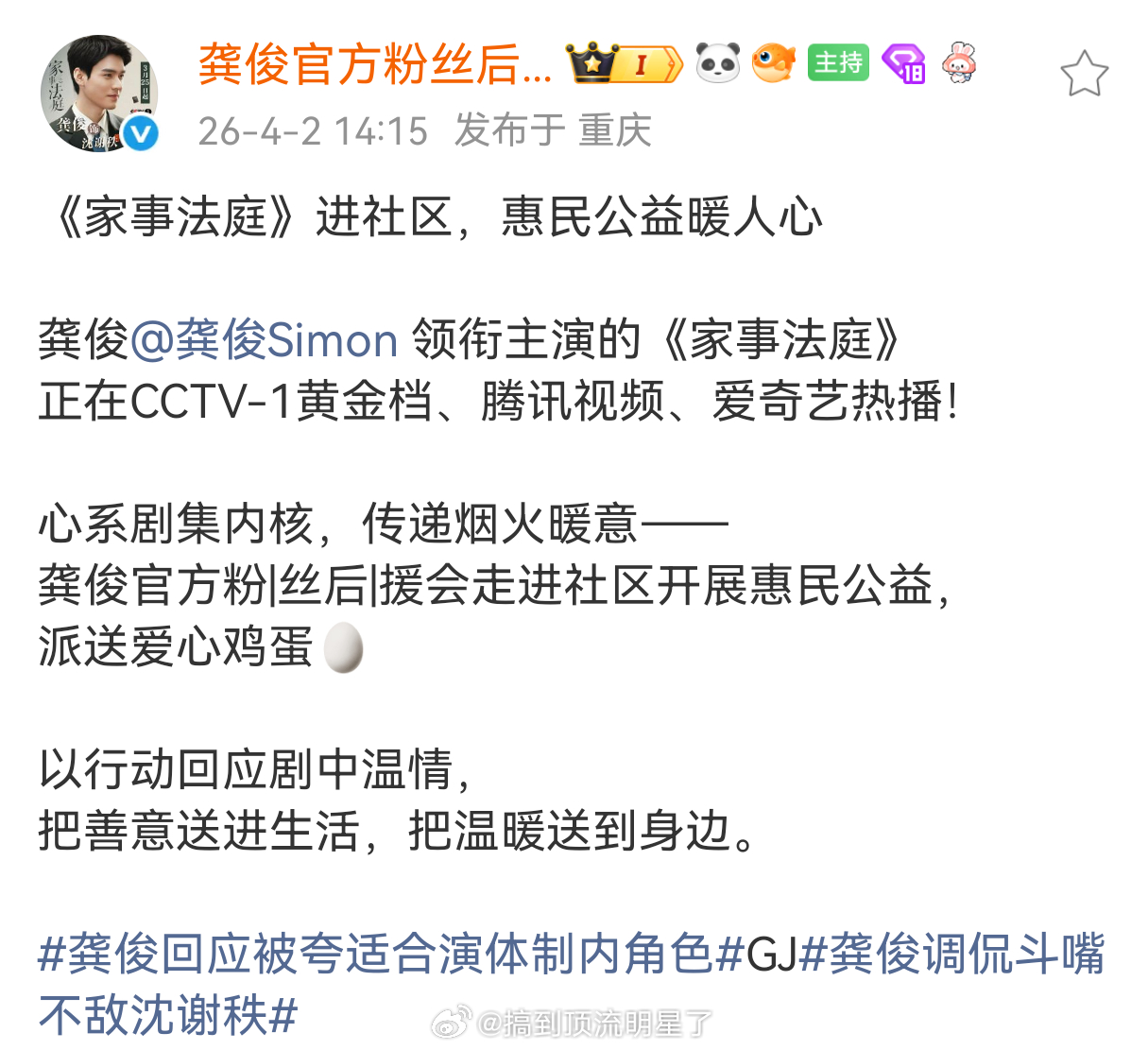 龚俊粉丝《家事法庭》惠民公益活动,进社区派送爱心鸡蛋,和家事法庭一样很踏实很落地很贴近生活,很棒家事法庭