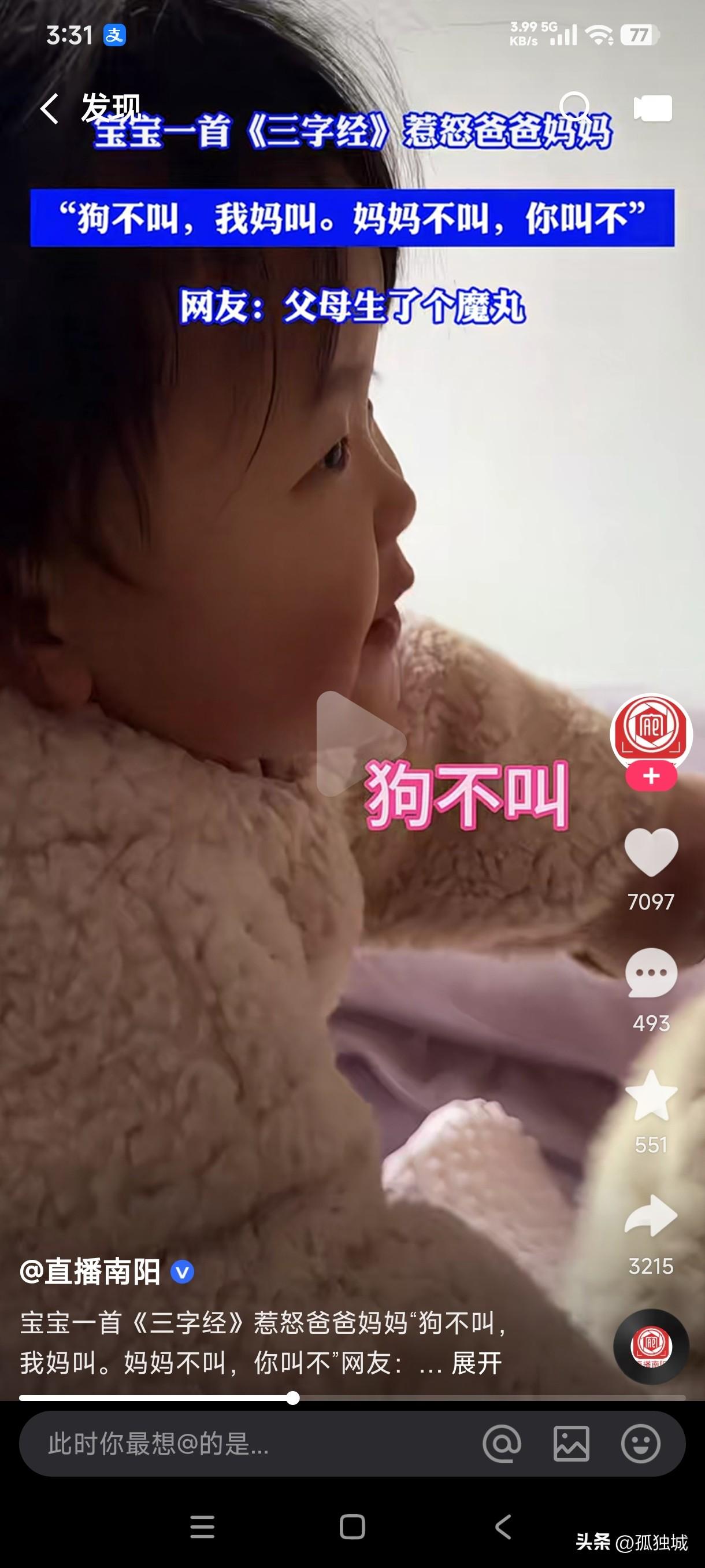 这孩子的三字经不知是谁给教的,这哪里是在背三字经,这不是变着法的在骂爸爸妈妈吗?这是把爸爸妈妈比喻成猪和狗了吗?为什么狗不叫,接下来不是让其它动物叫吗,偏偏非要让妈妈叫,妈妈不叫居然让爸爸叫,那爸爸不叫该让谁叫呢?接下来的背法是谁都没叫,熊孩子直接自己叫了,还是被爸妈混合双吼……这哪里是生了个孩子,这分明生了个磨丸吗?这孩子天生是不是来搞笑的?
