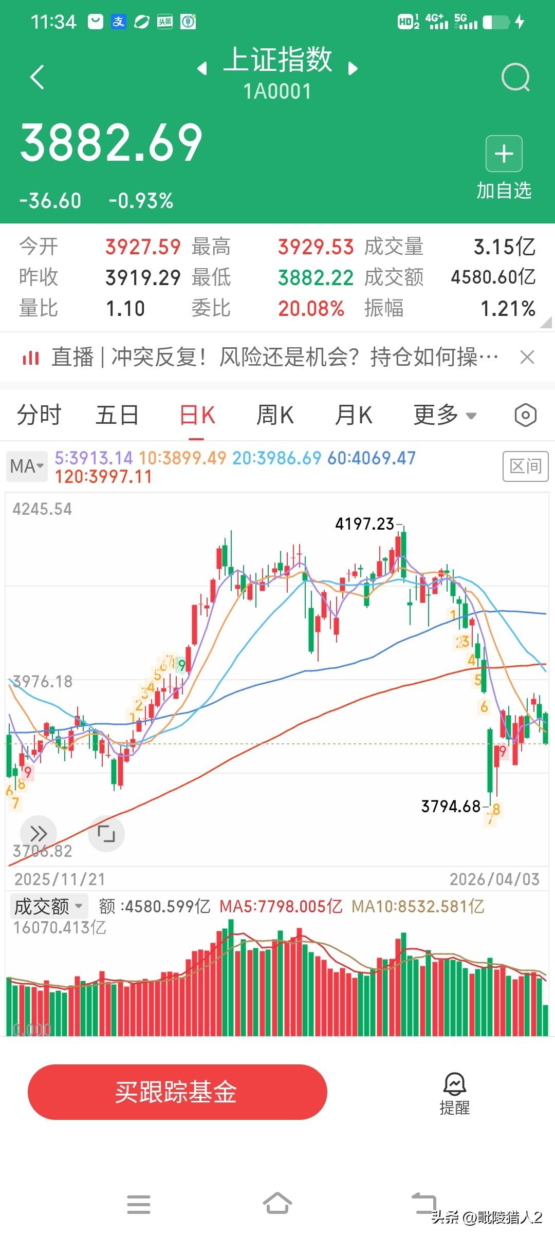 2、沪深指数5天均线掉头向下与10天均线产生空头共振,宣告前期反弹结束,指数大概率要开启新一轮下行。以沪指为例,有效跌破3900点就宣告前期反弹是中继下跌平台(图2)。