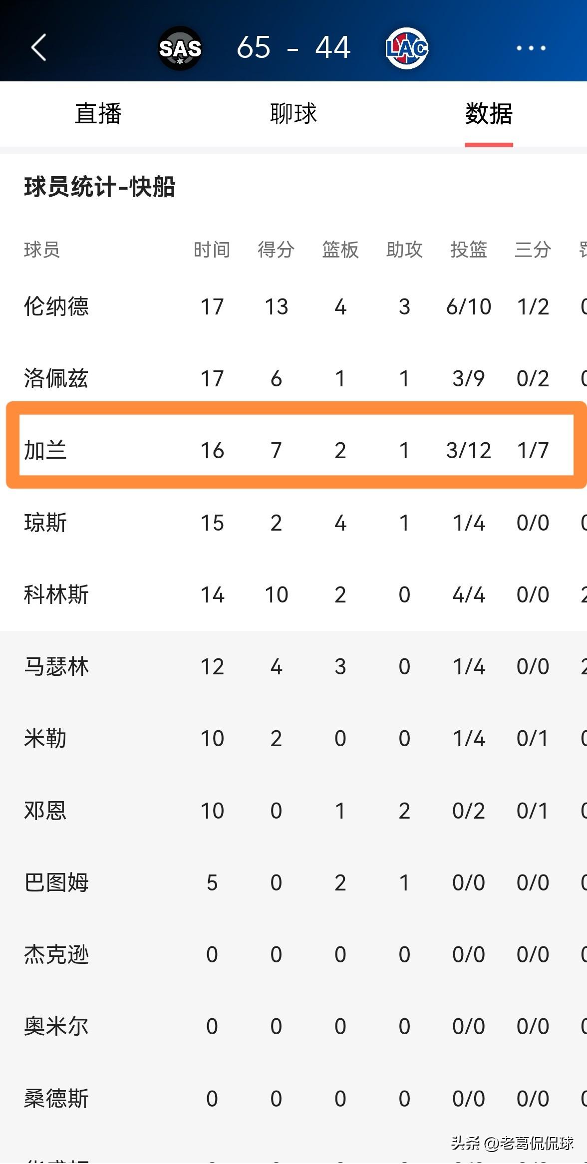 快船当家控卫加兰真是让人大失所望!在今天快船主场迎战马刺的比赛中,目前双方半场战罢,快船以44:65落后对手21分。让人感到特别失望的是,加兰在前两节比赛中的比赛非常的拉胯,他在进攻端完全是发挥失常。 在上半场比赛中,加兰首发出战16分钟,投篮12中3,其中三分球7中1、罚球2中0非常低效的得到7分,他的场上正负值为-8。 我相信当快船球迷亲眼目睹了加兰的低迷表现后,他们一定会特别想念詹姆斯-哈登。如果哈登没有被快船交易走的话,快船绝对不会落后马刺这么多分。
