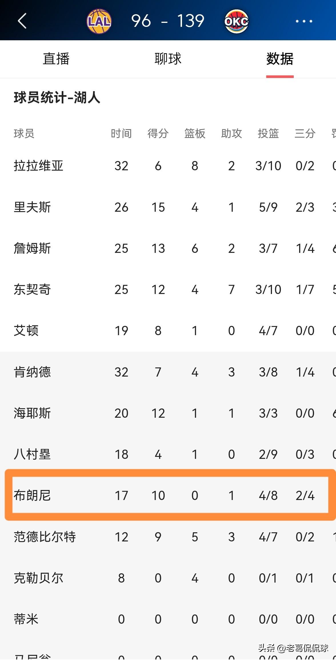 湖人超级新星布朗尼的得分竟然上双了!虽然今天湖人在客场以96:139惨败于雷霆,但是小将布朗尼在进攻端的表现非常的出彩,他在有限的上场时间里竟然得分上双了。 全场比赛下来,布朗尼替补出战17分钟,投篮8中4,其中三分球4中2非常高效的砍下10分,还有1助攻1盖帽,他的场上正负值为-8。 毫不夸张的说,如果布朗尼的场均上场时间能够达到20分钟,我相信布朗尼的场均得分肯定能够上双。