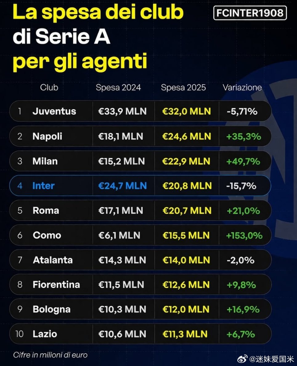 国际米兰去年给经纪人的佣金排在第四,同比大幅度下降。国际米兰意甲意大利连续3届无