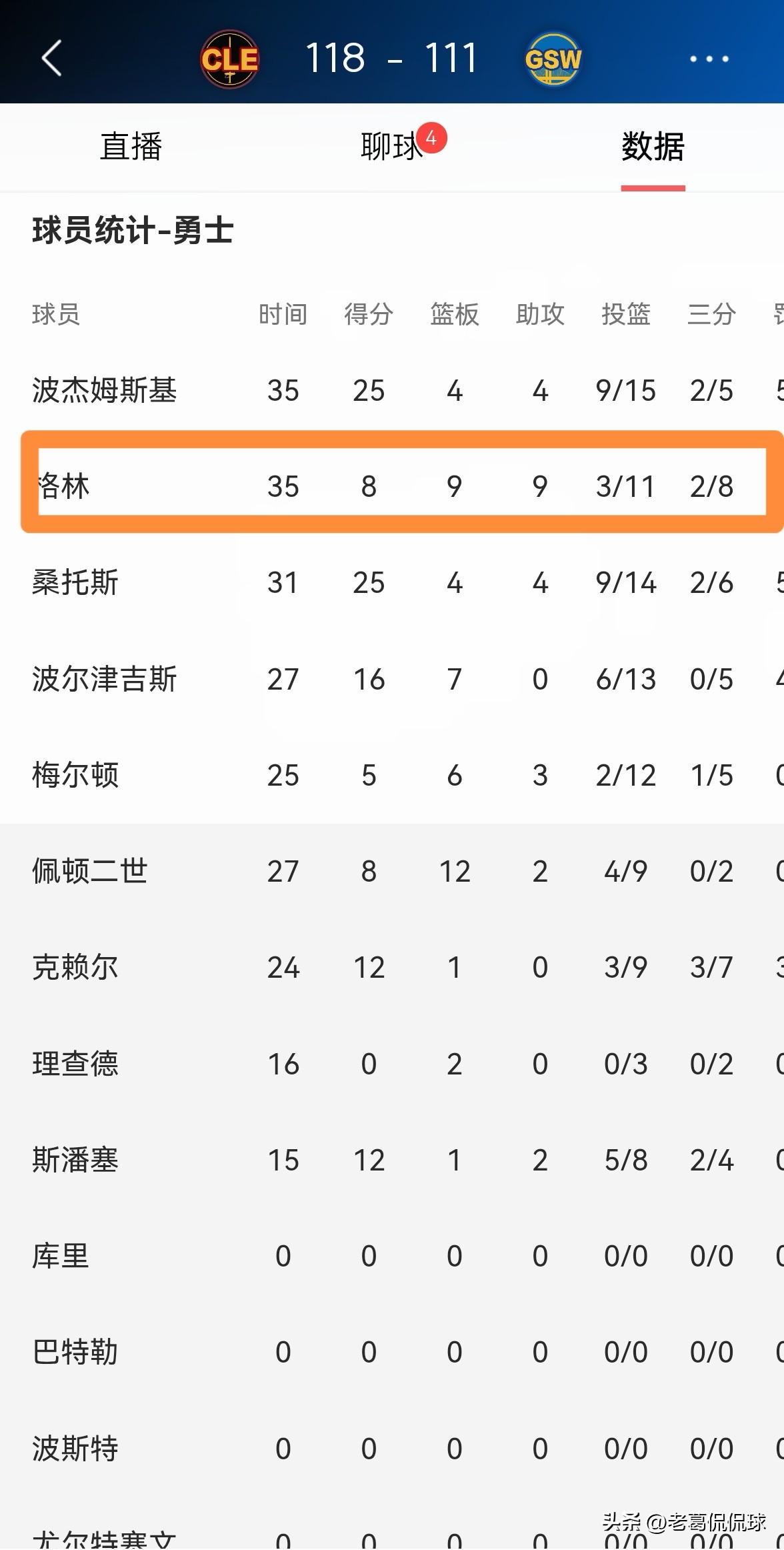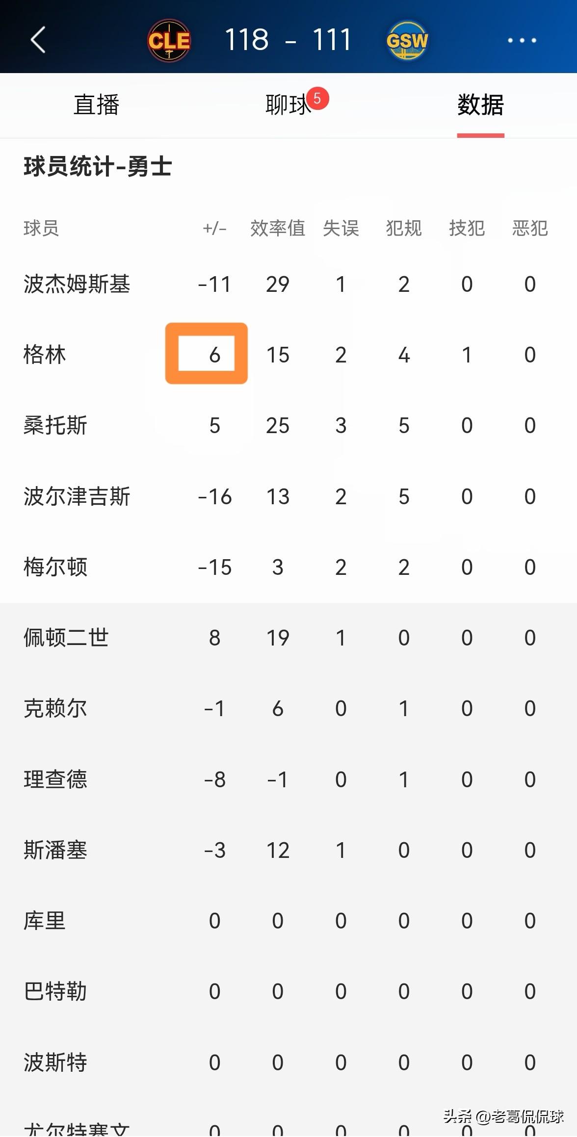 我终于有机会好好夸夸老将追梦格林了!虽然今天勇士在主场以111:118惜败于骑士,但是追梦格林的整体表现还是非常出色的,他在首发出战的35分钟里,投篮11中3,其中三分球8中2得到8分9篮板9助攻1抢断3盖帽,他的场上正负值为球队首发阵容里最高的+6。 实事求是的说,本场比赛追梦格林在攻防两端都拼尽全力了,勇士输球的主要原因在于实力不济,不过追梦格林的表现确实值得称赞。