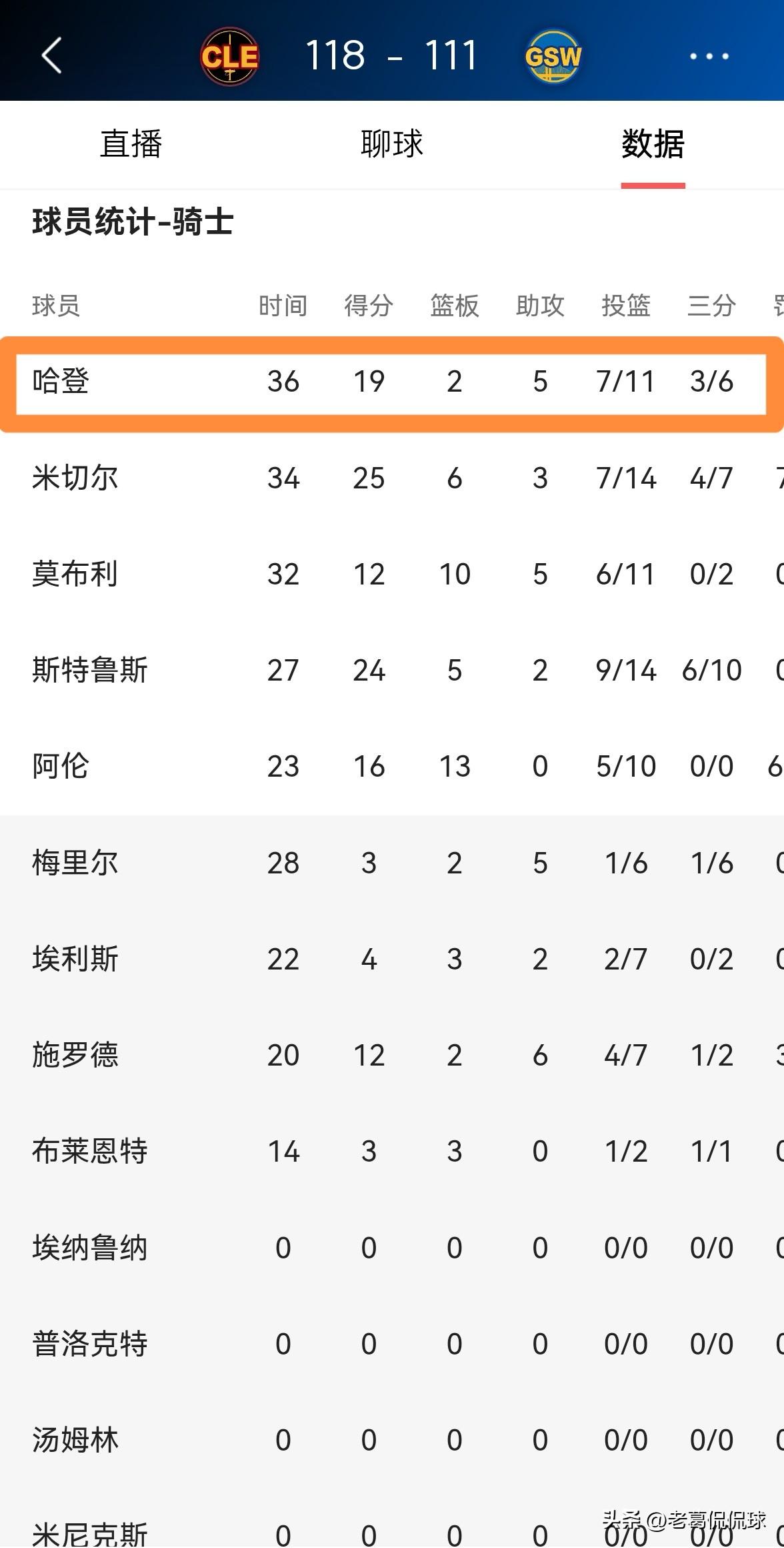 骑士超级巨星哈登真是太平淡了!在今天骑士客场以118:111力克勇士的比赛中,哈登的表现非常的平淡,完全没有展现出超级球星的风采。 全场比赛下来,哈登首发出战36分钟,投篮11中7,其中三分球6中3、罚球2中2得到19分2篮板5助攻,还有4次失误,他的场上正负值为+1。 坦白说,本场比赛哈登在进攻端完全没有发力,不然的话他的表现也不会如此的平淡。