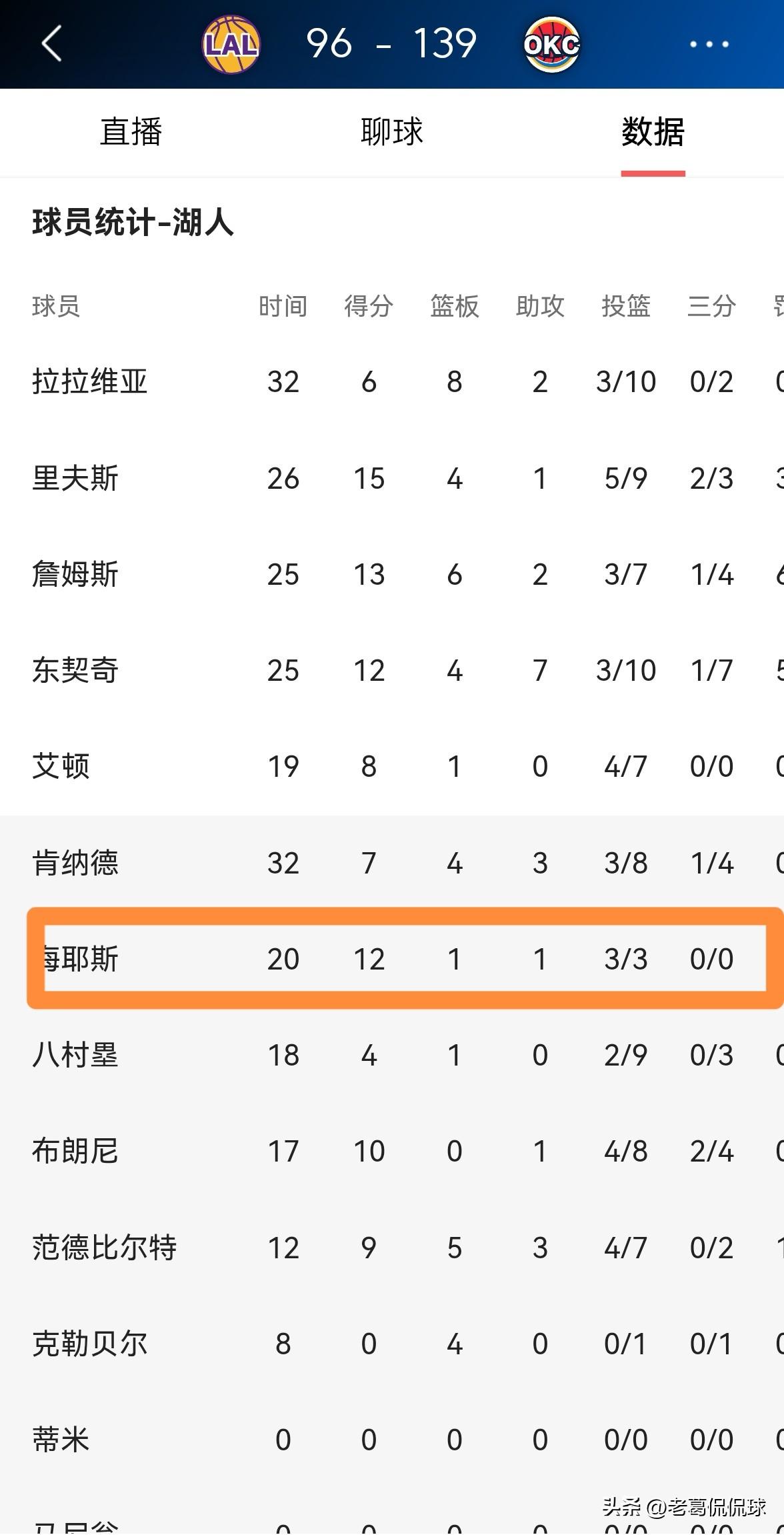 湖人替补中锋海斯竟然怒抢1篮板!在今天湖人客场以96:139输给雷霆的比赛中,身