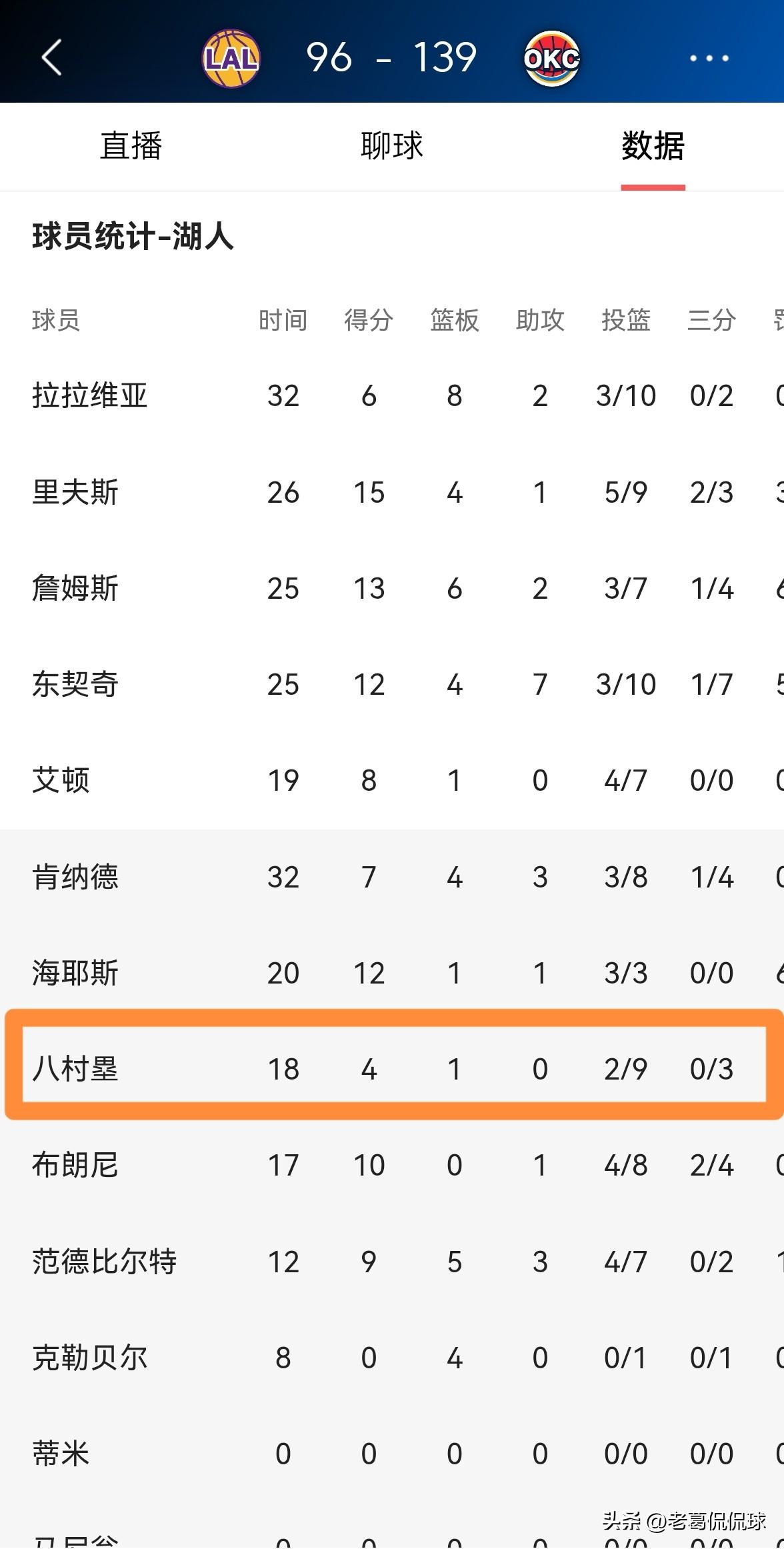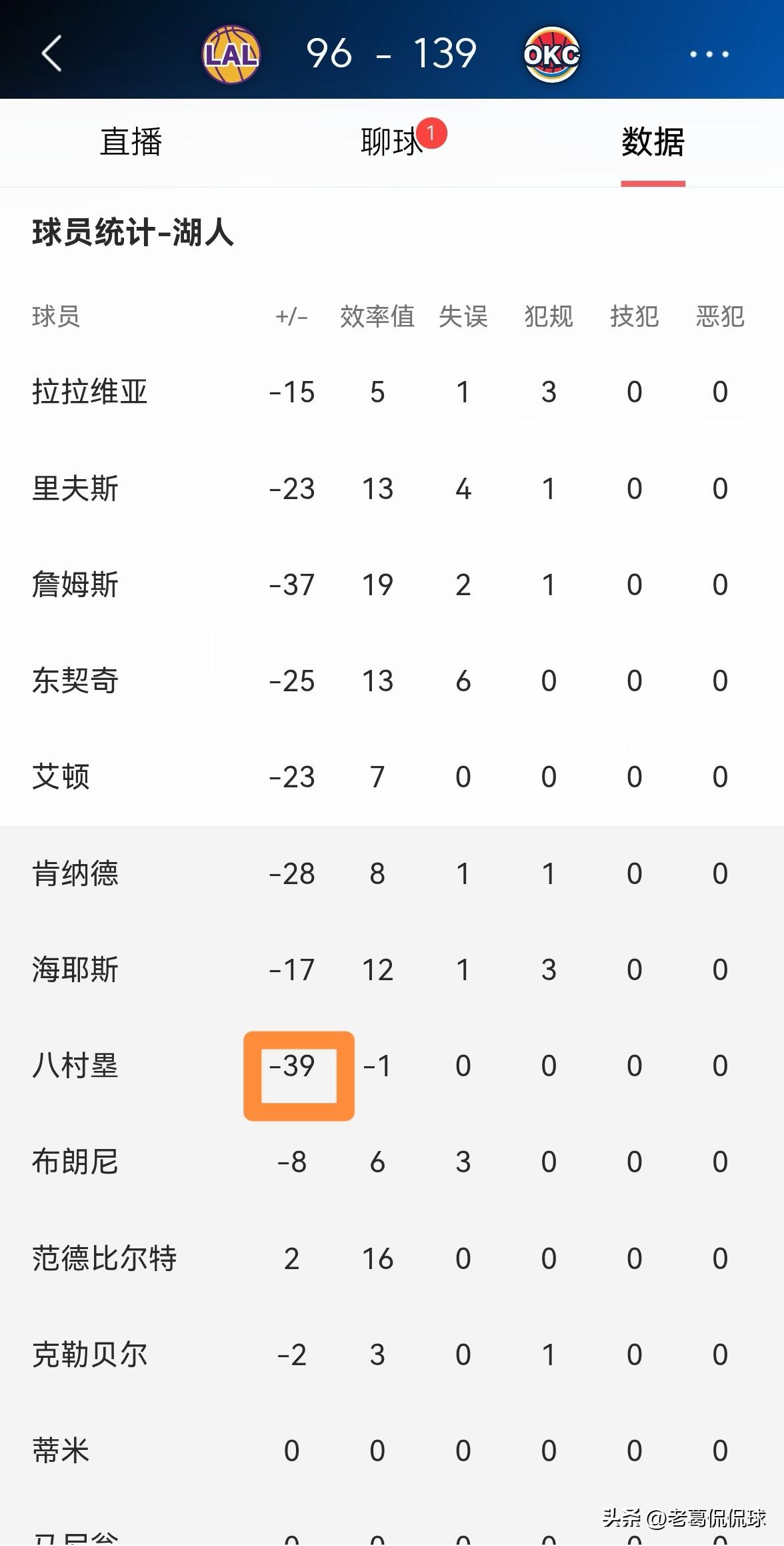 湖人大将八村塁的场上正负值真是低的吓人!在今天湖人客场以96:139惨败于雷霆的