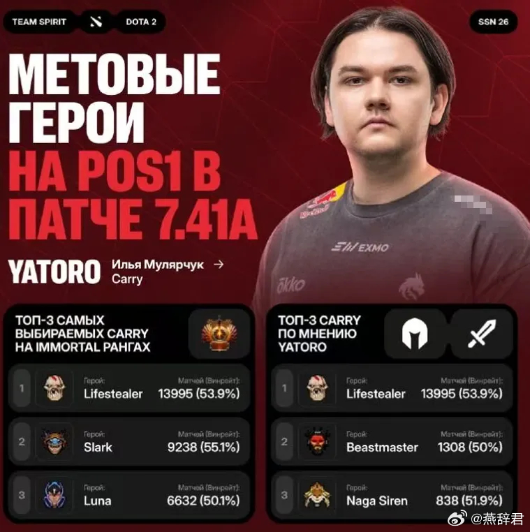 Yatoro推荐了三个一号位英雄,分别是小狗,兽王,小娜迦,左边是冠绝分段的胜率前三,分别是小狗、小鱼、Lunadota2