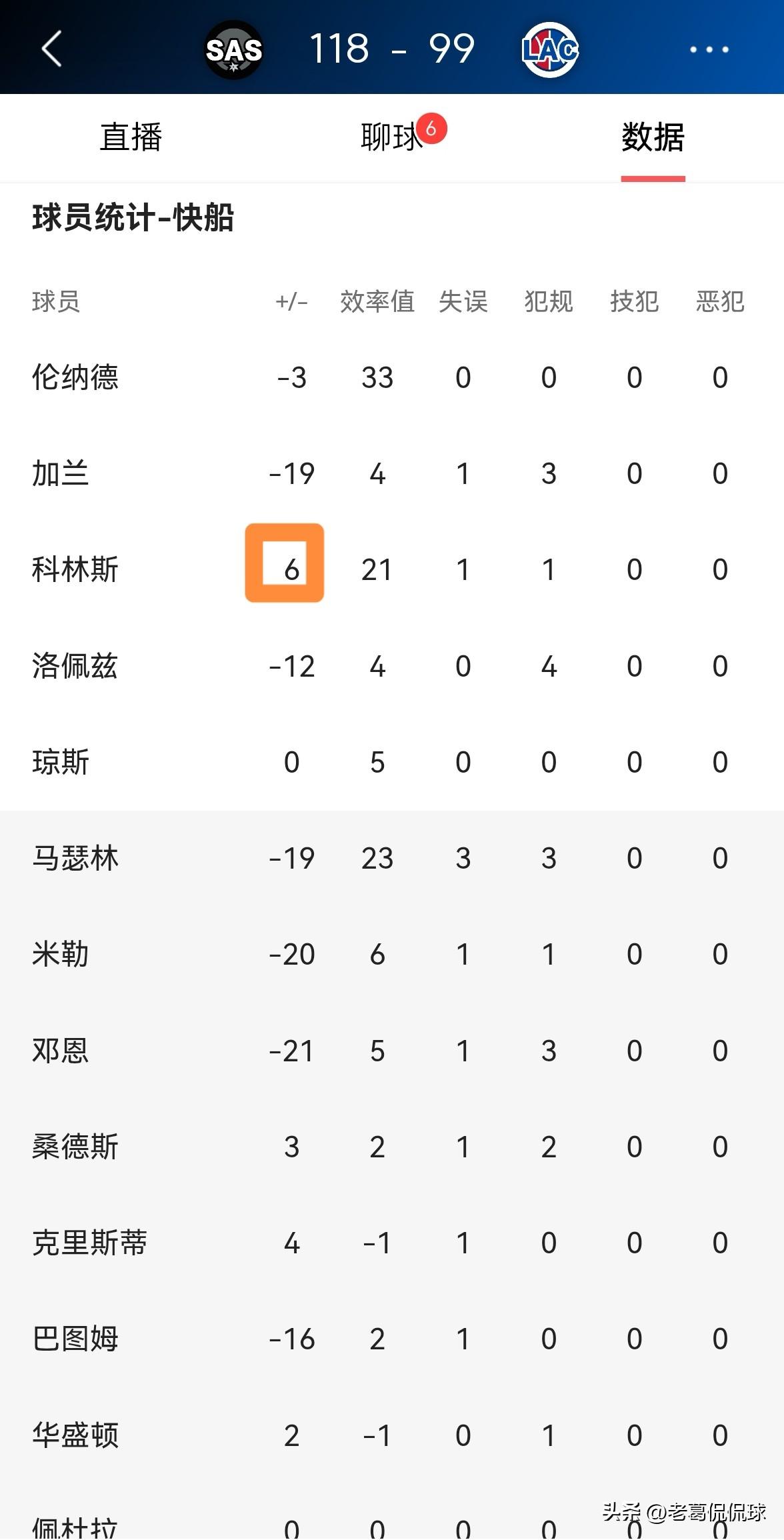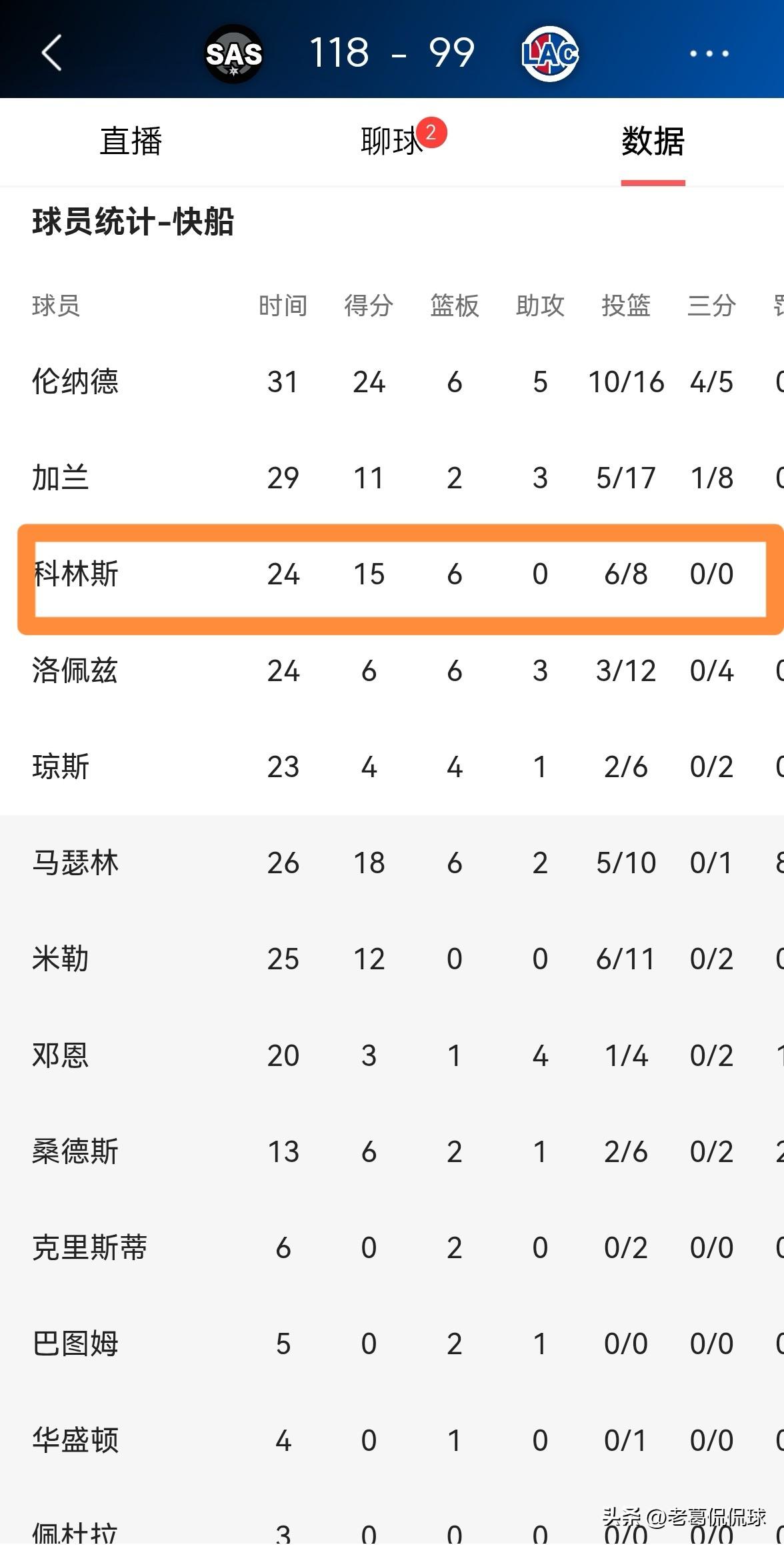 快船大将科林斯的出手数真是太少了!在今天快船主场以99:118惨败于马刺的比赛中,科林斯在手感火热的情况下仅仅出手了8次,而手感冰凉的加兰和洛佩兹却合计出手了29次。 全场比赛下来,科林斯首发出战24分钟,投篮8中6,其中罚球3中3非常高效的砍下15分,还有6篮板,他的场上正负值为球队最高的+6。 毫不客气的说,如果快船想要在季后赛中有所作为的话,球队必须增加科林斯在进攻端的戏份,并且要减少洛佩兹的出手权。