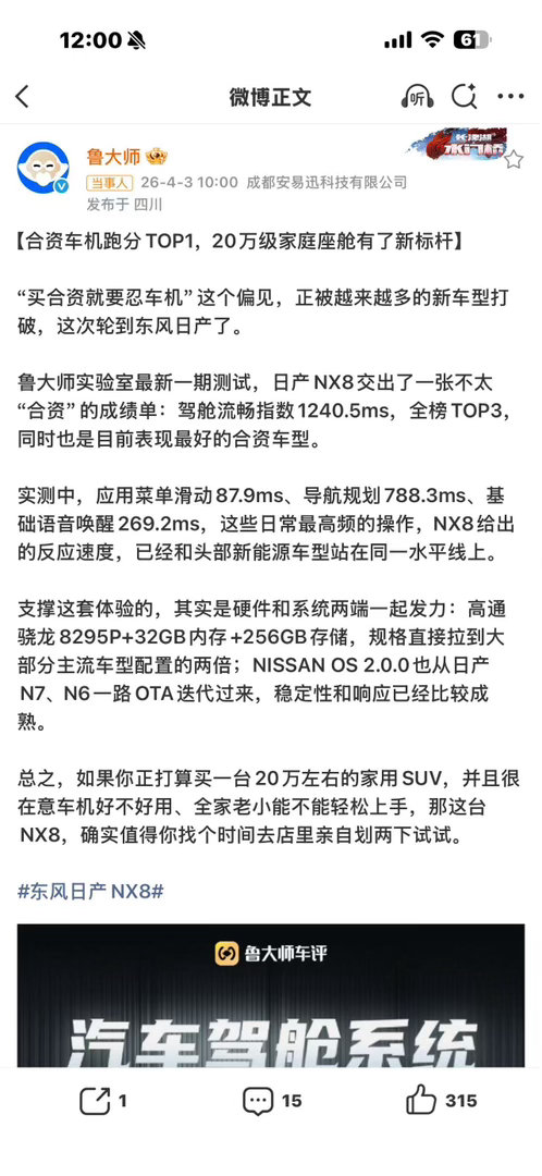 东风日产NX8凭借强大车机登顶合资TOP1,双15.6英寸2.5K联屏操作丝滑。同时,760mm后排膝部空间超宽敞,全域智能防晕车功能升级,是20万级五座SUV舒适之选。合资一发力车机TOP120万级大大大五座智慧舒享SUV东风日产NX8