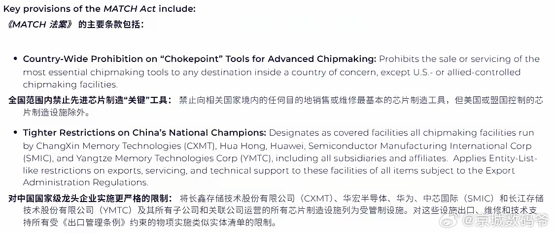 美国国会抛出了史上最严的对华芯片管控法案(MATCH法案),这是一个两党都支持的法案,落地的可能性很大:1.长臂管辖,要求盟友150天内与美国实施同等管制。2.扩大管制清单DUV光刻机、TSV沉积与蚀刻工具等全部纳入管制。3.明确对长鑫存储、华虹半导体、华为、中芯国际 以及长江存储实施更加严厉的管控。4.全面维护禁令:禁止对中国工厂的设计提供任何安装、维护、校准以及软件更新。