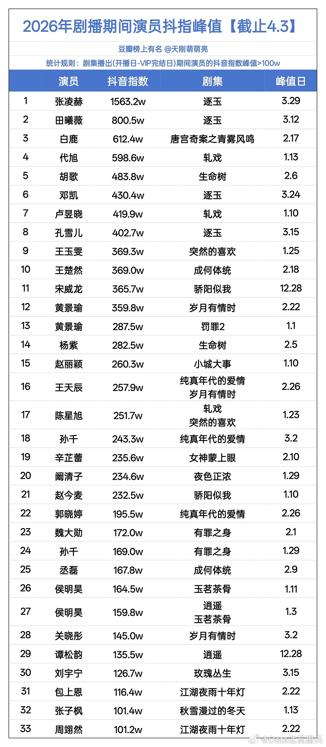 2026年演员抖指峰值汇总【截止4.3】前五:张凌赫、田曦薇、白鹿、代旭、胡歌