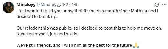 Vitality明星狙击手ZywOo与女主播Minaleyy在交往六年后结束了恋情。Minaleyy在个人X频道上发布的一则帖子中宣布了这一消息,ZywOo本人尚未对此事进行公开回应。