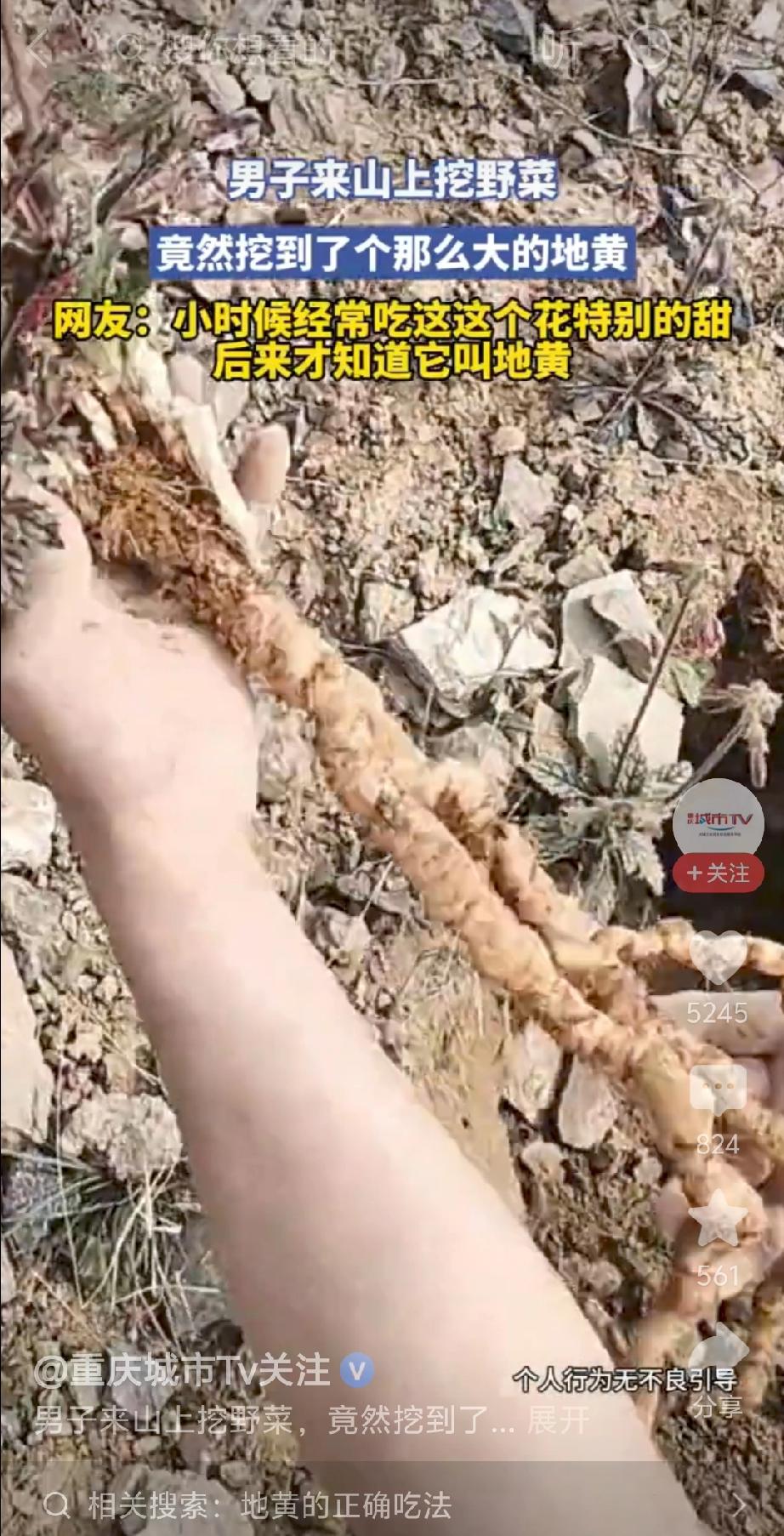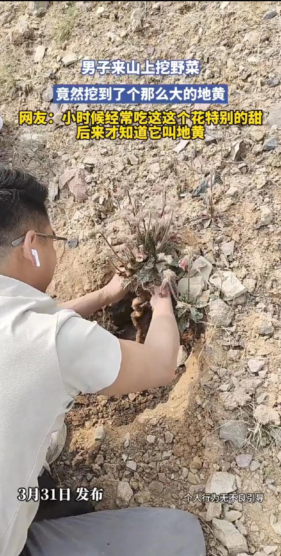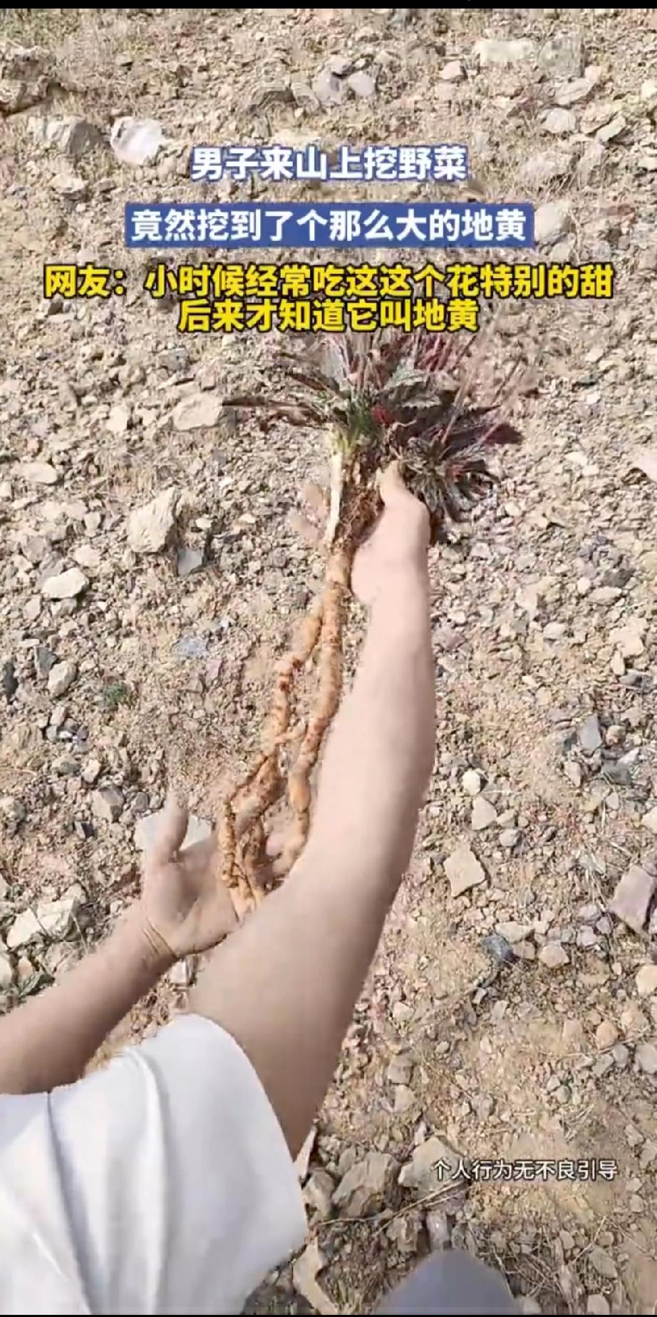真是活久见!4月1号,重庆一男子上山挖野菜,本想挖点蒲公英,荠菜,回家尝鲜,没成想一锄头下去,挖出个少见大宝贝,超大地黄当场把人看傻! 真正让人愣住的,往往不是山里有什么,而是锄头落下去那一下,手上传回来的感觉不对。 4月1日上午9点左右,重庆一位姓李的男子背着篮子、拎着锄头和小铲,照常往家门口后山走。目标很普通,荠菜、蒲公英,挖够一顿春菜就回家。谁会想到,半山坡上一记下铲,碰到的不是石头,也不是烂树根,而是一团带着韧性、又压手得很的东西。 这一下,故事就变了。 常在山里转的人,其实都懂那种分寸感。真碰上硬石,反弹是肯定的。碰上老根,纤维感很明显。可那天那一下,不像石头。李某没再蛮挖,干脆蹲下,用手慢慢扒土,再换小铲一点点清边。人累得冒汗,腰也酸,硬是磨了半个多小时,才把土里的东西完整带出来。 东西见光的时候,周围人都安静了。 那是一棵野生地黄。重约十多斤,最长接近1米,最粗的地方比成年男人上臂还要壮,通体黄褐,主根蜿蜒,旁边缠着一串侧根,远看像一条伏在土里的龙。拿它和日常见到的那种细小地黄相比,完全不是一个量级,体量至少大出十倍。 村里人很快围过来了。有人在山里走了大半辈子,鞋底不知磨坏多少双,还是头一回见到这么大的野地黄。那种惊讶,不是夸张,是经验突然失效后的停顿:按常识,这东西不该长成这样。 问题就在这儿。它为什么能活到今天,还长成今天这个样子? 地黄不是一年生杂草,它是多年生药材,古籍里早有记载。要长出这种体格,靠的不是运气爆发,而是时间一层层往上压。少说也得几十年。 几十年是什么概念?意味着它得躲过采挖,躲过牲畜和野猪拱食,躲过水土流失,还得碰上合适的坡向、湿度、土质。少一项,都未必撑得住。 换句话说,李某挖到的不是一棵“大药材”那么简单,而是一个罕见的幸存者。 这几年,野生药材越来越难见到“大个头”,原因并不神秘。市场盯得紧,稍微像样一点的苗,往往还没长开就被挖走。再加上山里活动的人多了,老路变新路,偏僻处越来越少,许多野生植物刚冒头就暴露在人的视线里。你说它还能不能慢慢长?显然很难。 也正因为这样,这次发现才有了另一层意味。它不是“山里宝贝很多,等着人去捡”,恰恰相反,它像一次低概率事件突然撞上了普通日常。一个人只是想挖点野菜回家包饺子,顺手摘些蒲公英,结果把一段埋在地下几十年的时间给翻了出来。 这件事传开后,李某拍的视频很快上了网。评论区有意思,不只是惊叹个头大,更多人一下被拉回了童年。有人说老家把它叫“蜜罐棵”,有人叫“蜜蜜罐”,小时候不懂什么药材,只知道它开花的时候,摘下一朵吸一口花蜜,甜得很。 那种甜,不是什么高级滋味,就是物质并不宽裕时,孩子从土地上直接拿到的一点奖赏。 你看,为什么一棵地黄会让这么多人起反应?因为大家围观的,不只是“稀奇”,更是已经远去的生活经验。以前的孩子认得花、认得草,知道哪种能吃,哪种能闻,哪种只是看看别碰。现在的人也爱春天,也想上山挖点野菜,可很多连接已经断了,只剩下“听说这个能吃”。 这恰恰是热闹背后更该警惕的地方。 春季挖野菜,本来就带风险。有些可食植物和有毒植物,外形很像,不熟悉的人靠“差不多”去认,出事就是一顿饭的距离。像水芹和毒芹,像折耳根和某些相似草本,真不是随便看两眼就能分清。李某这次遇到的是惊喜,可同样一锄头下去,别人也可能挖出麻烦。 李某在山上挖出一棵巨型地黄,引发热议。此事最可贵的,是那份“慢”的启示。采挖时他不图省事,懂得留有余地,这种朴素的态度正契合自然规律。 地黄药食同源,但性凉,肠胃弱者需慎食。网友规划的晾晒、炖汤之法,尽显普通人得意外之喜后顾家、留余味的生活逻辑。 更深层看,它照见了人与土地关系的变迁。昔日山是生活的一部分,如今仅成背景。 人们靠短视频识植物,自然仍有馈赠,却少了耐心去懂、给它生长的时间。 这棵地黄的出现,是自然的馈赠,也需以敬畏之心对待。取之有度,留有余地,方能让土地继续为人们送上意外之礼,让平凡日子藏着惊喜,让土地深处埋着旧日回声。🌿 参考信息:网易新闻.(2026-04-02).男子挖野菜挖出个“巨无霸”地黄,网友却集体想起了童年那口甜。