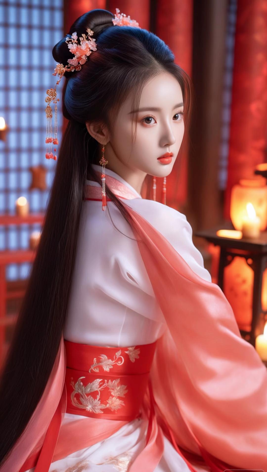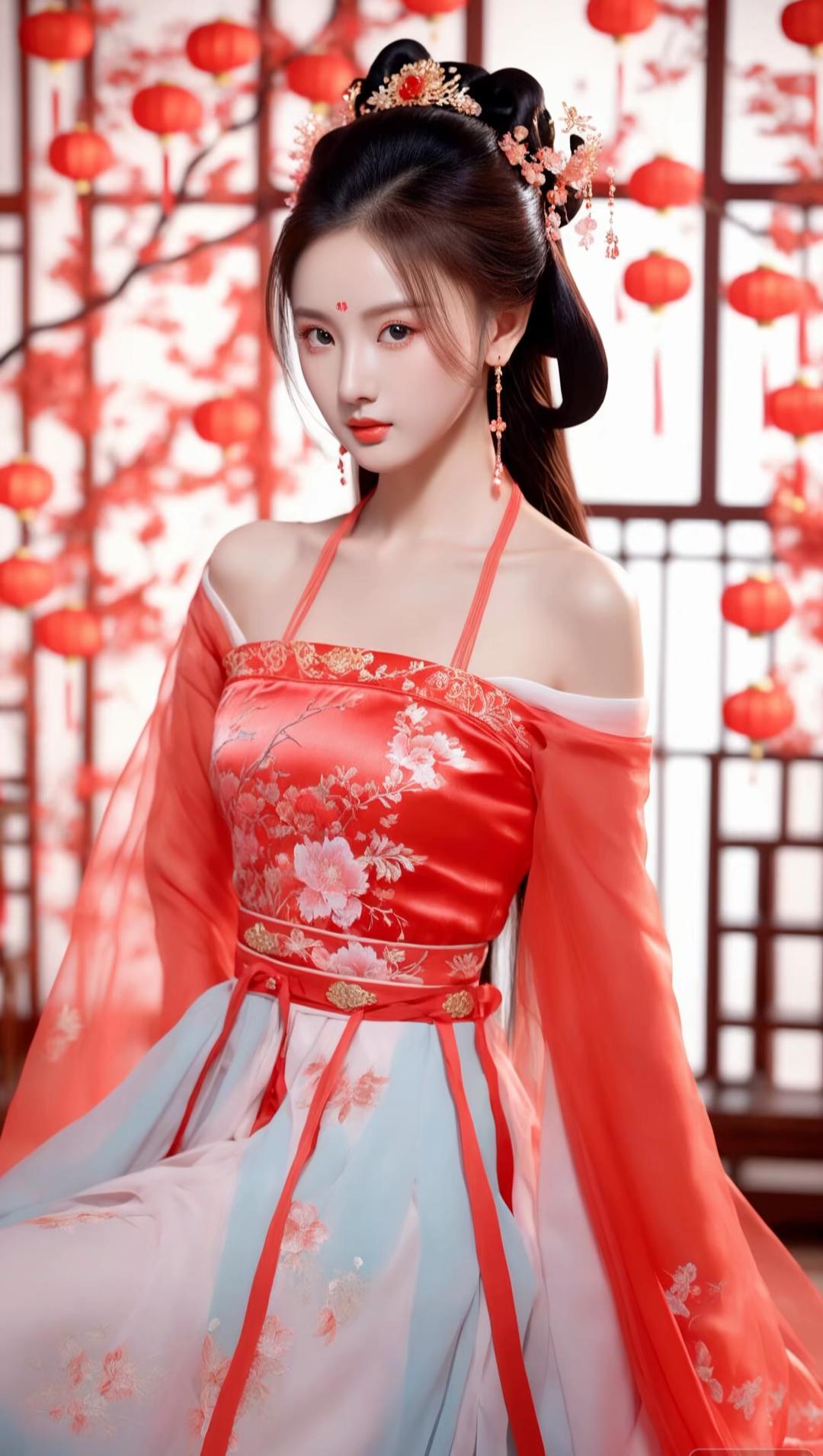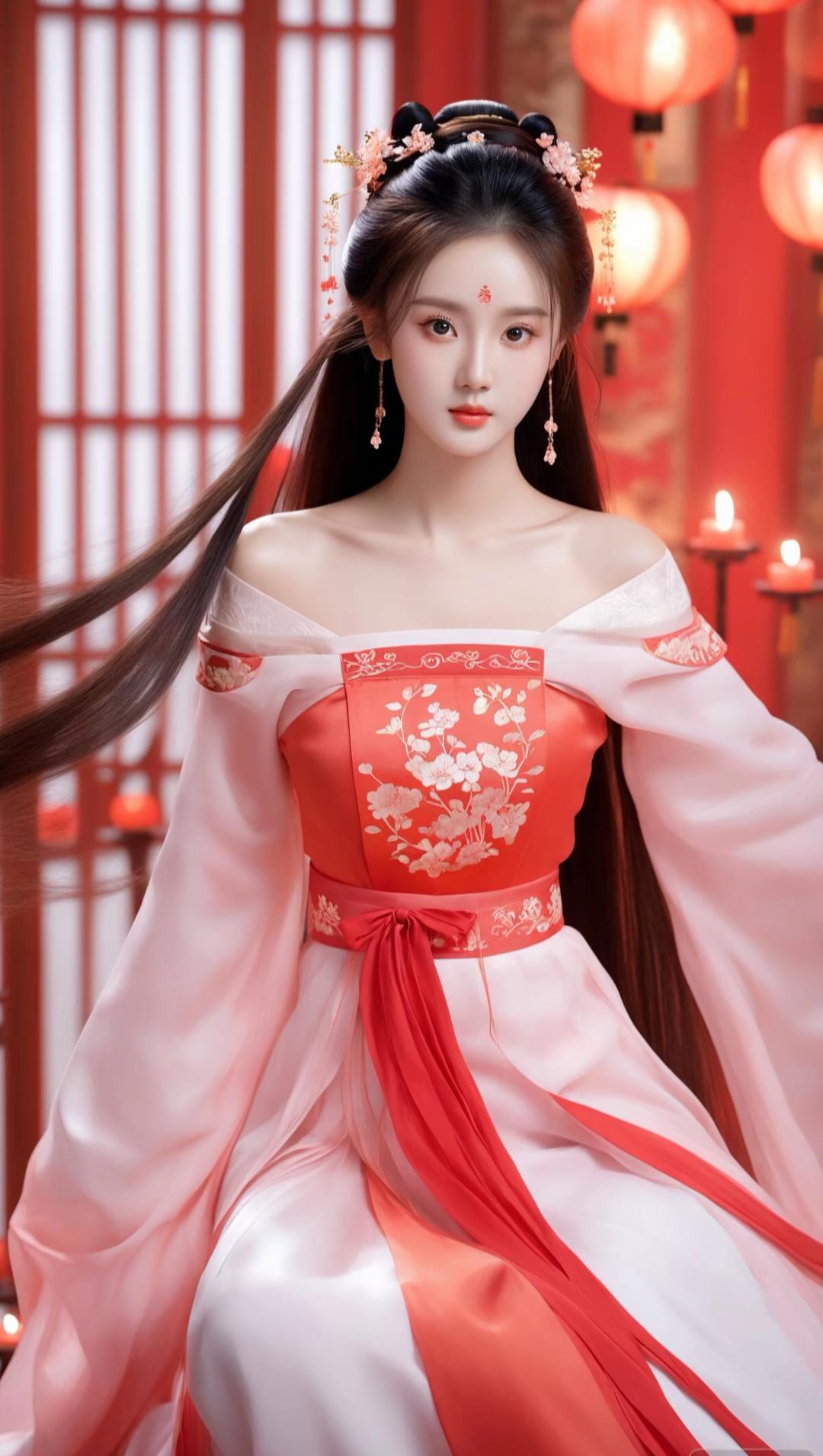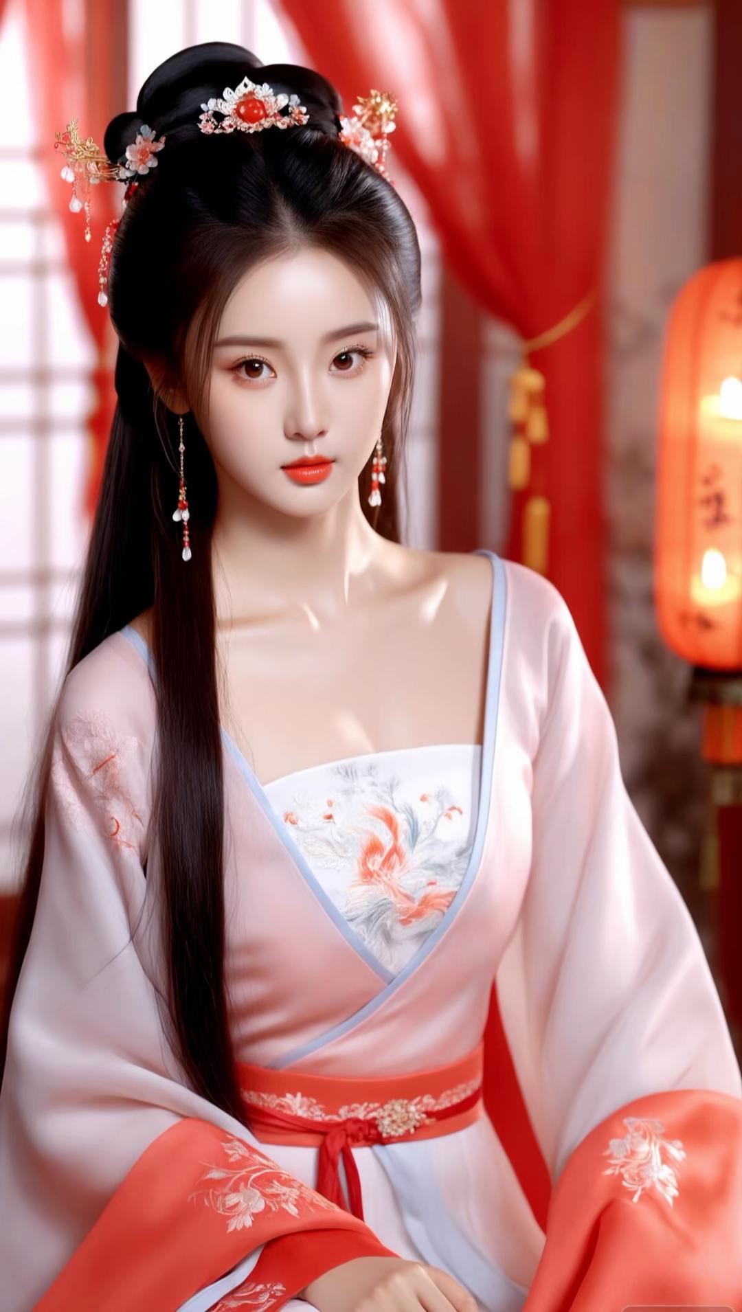 服饰:身着多款红粉渐变古风裙装,融合抹胸、齐胸襦裙、广袖等设计,衣身绣有牡丹、花卉等精致纹样,红、粉、蓝三色搭配层次丰富,轻纱广袖飘逸灵动,尽显古典优雅与柔美风情。